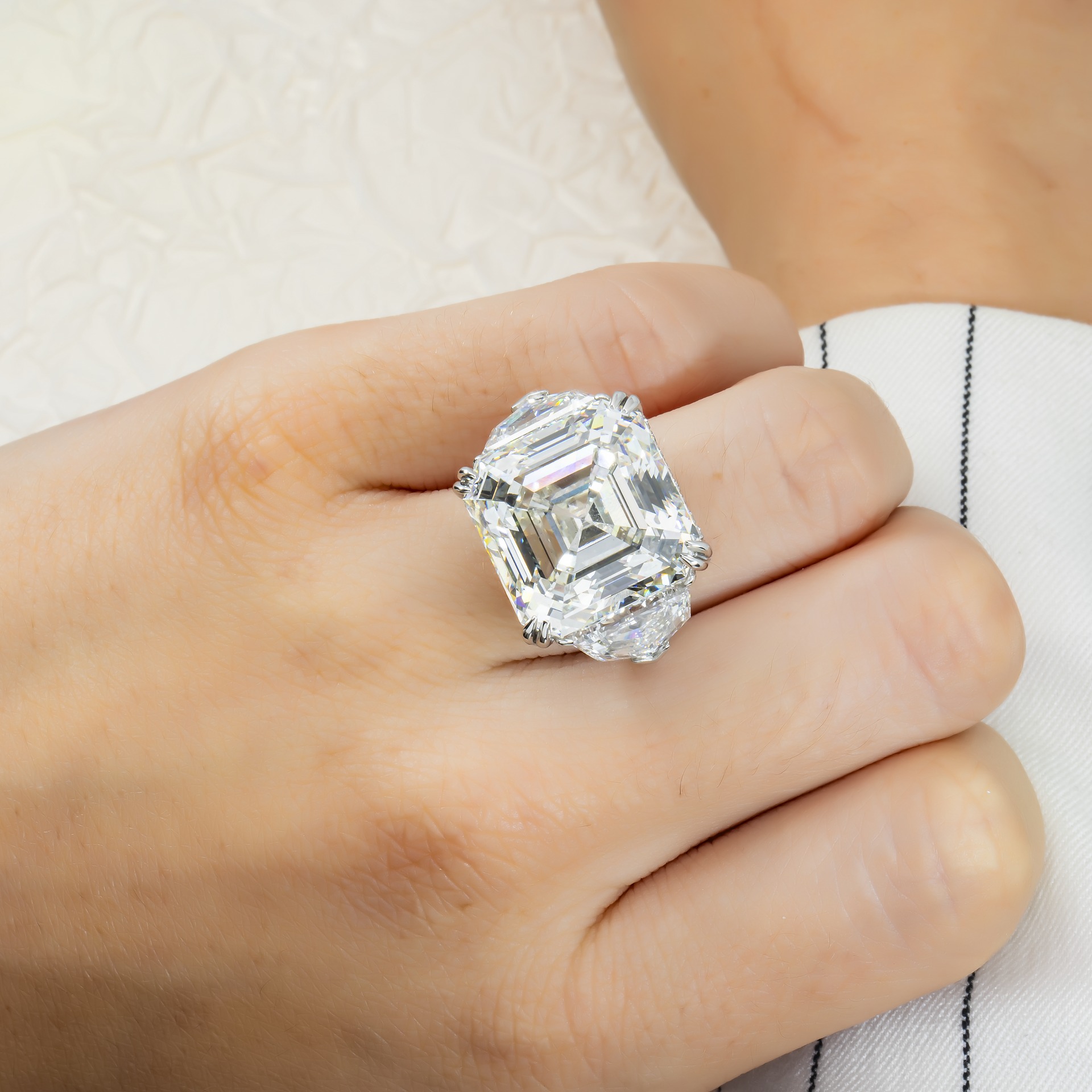 For clients who enjoy a strong diamond look, the 30.48 carats of Asscher diamonds provide exactly that effect. The ring feels like a true high jewelry statement when you enter a room, yet remains balanced enough to be worn with confidence every day.