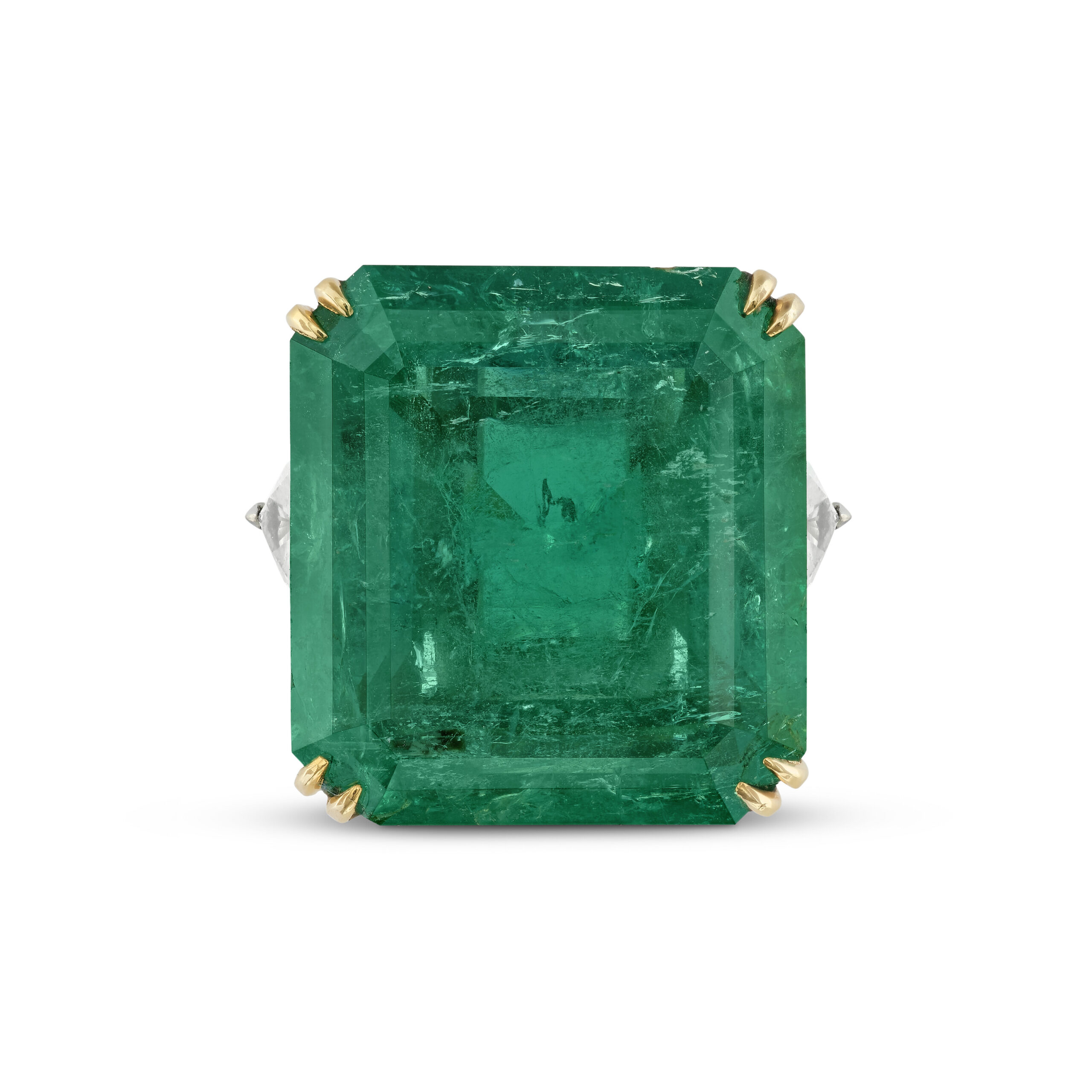 Approximately 30 carats, emerald, statement ring, diamond ring. A serious diamond ring with disciplined selection—meant to read clean at normal viewing distance. Colour family: Emerald Green. Every decision is made for visual integrity: even sparkle, clean outline, and a flattering look across lighting conditions. Its value is in its discipline: the ring looks composed up close and commanding from across a room. For clients who invest in fewer, better jewels—and want that decision to show. Collector’s Grade Grandeur—a piece defined by brilliance, poise, and longevity.