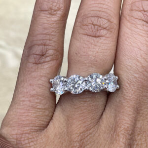 From there, individual seats are cut and refined under magnification, claws are drawn in to trace the natural outline of the stones, and the inner curve of the shank is shaped so approximately Carat weight on request of Brilliant White brilliance feels centred, stable and comfortable. The result is a ring that looks effortless from above, yet carries the kind of quiet engineering and hand-finishing you expect from serious high jewelry, not factory-made pieces.