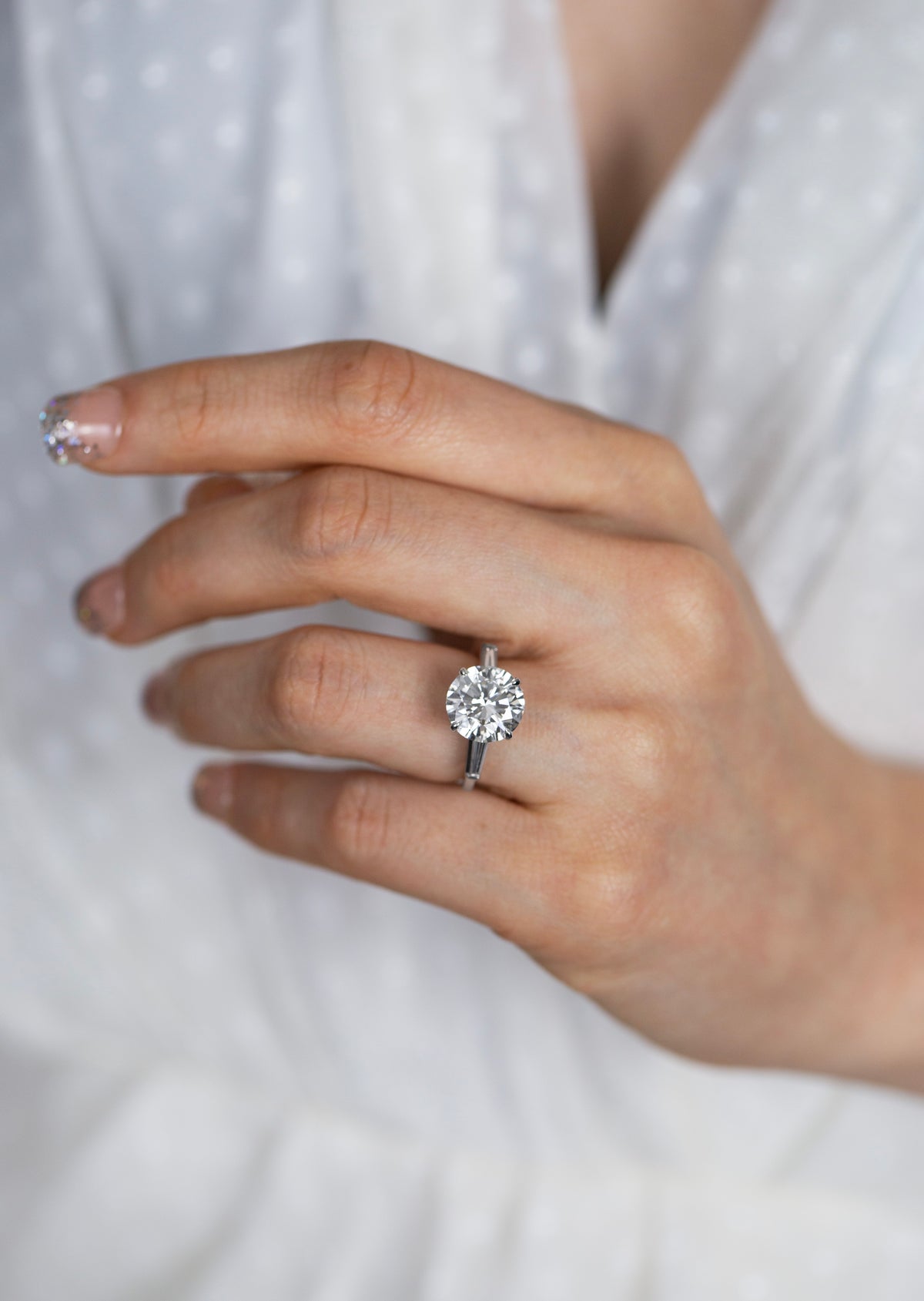 From a styling perspective, the strength of this design lies in its clarity: a disciplined row of Round diamonds, a focused 4.16 carats of Brilliant White light and a considered Three-Stone Ring profile. In everyday use, that means you can keep everything else quiet and still feel fully dressed – a single bracelet, a classic pair of earrings and perhaps one additional ring are more than enough.
