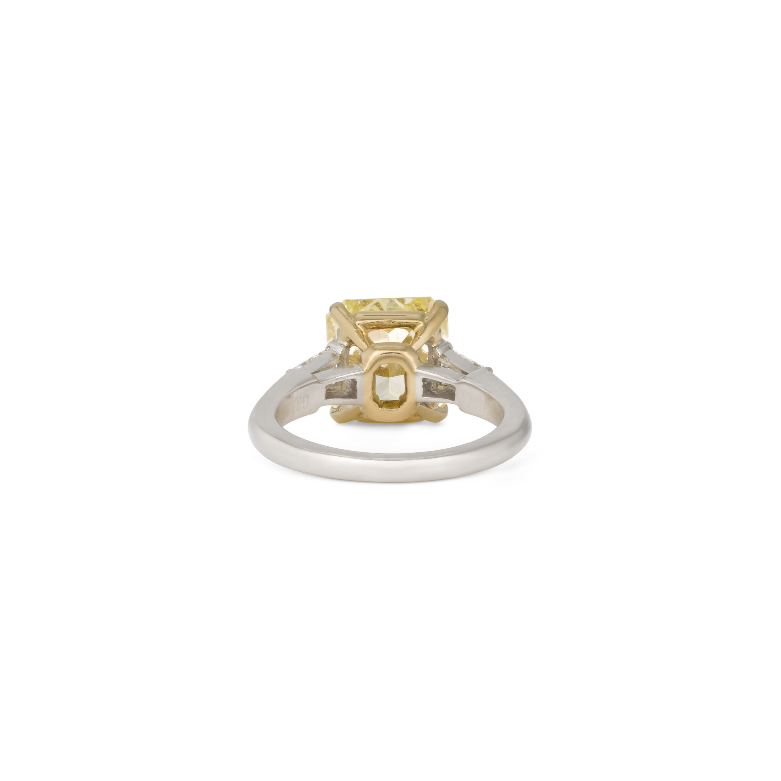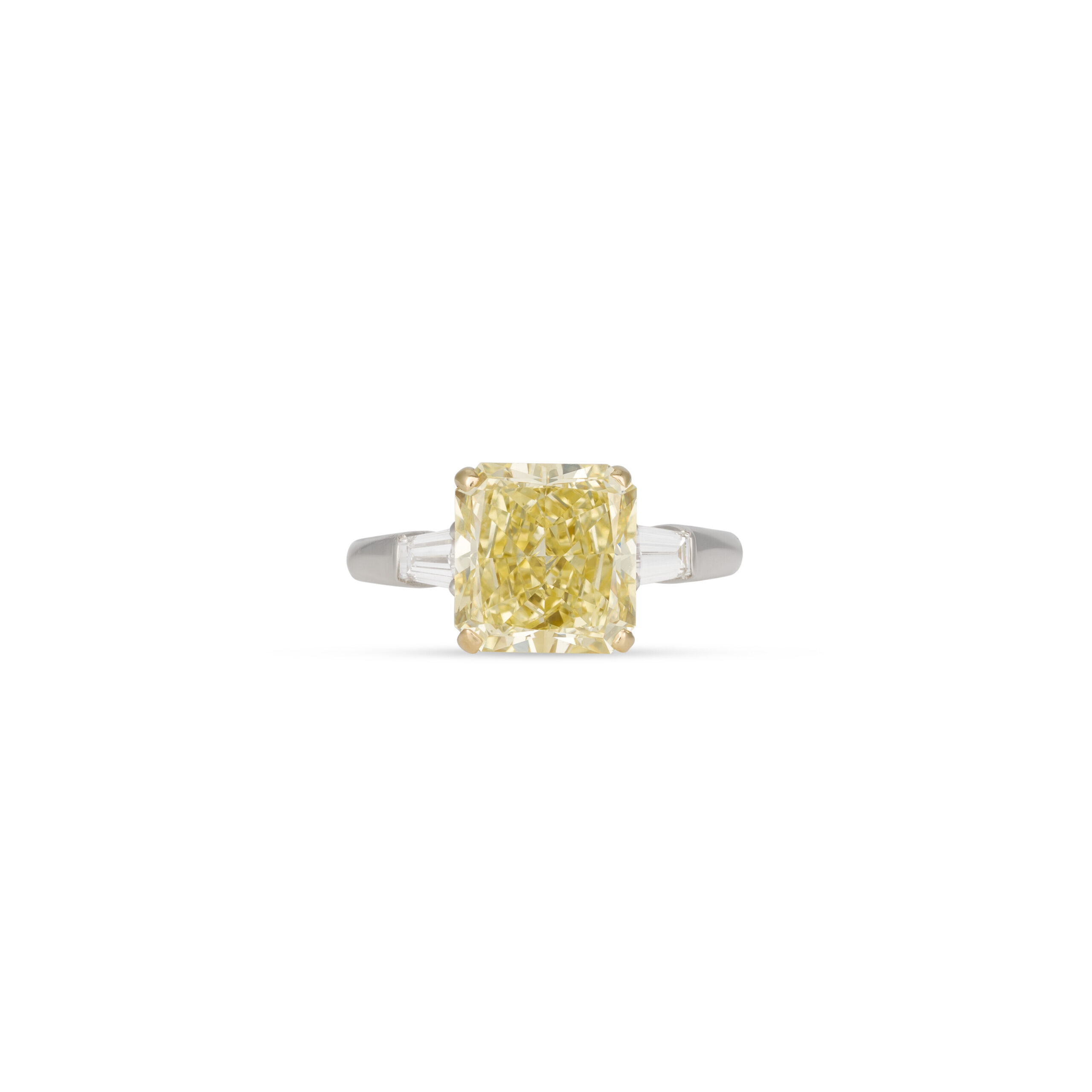 The carat weight of approximately 4.23 carats has been deliberately focused into the area that matters most: the top of the finger. This concentration of Fancy Yellow light allows the ring to photograph powerfully and to hold its own beside serious timepieces and bracelets.