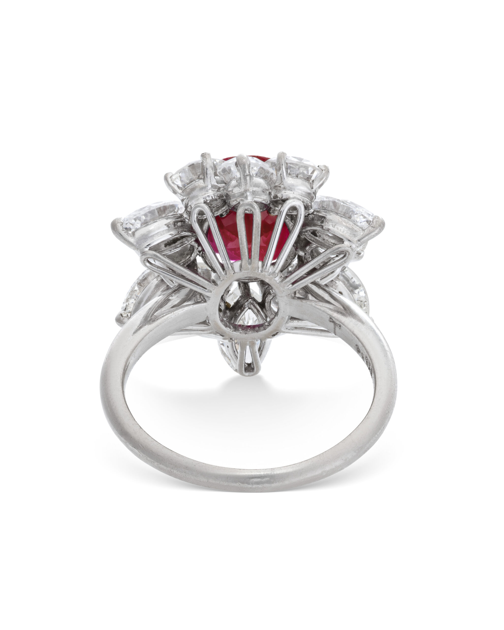 Every diamonds and gemstones in this design has a job to do. The approximately 4.31 carats of Ruby Red oval diamonds are arranged so that larger diamonds and gemstones carry the broad flashes of light, while supporting diamonds and gemstones fill in the gaps with fine scintillation.