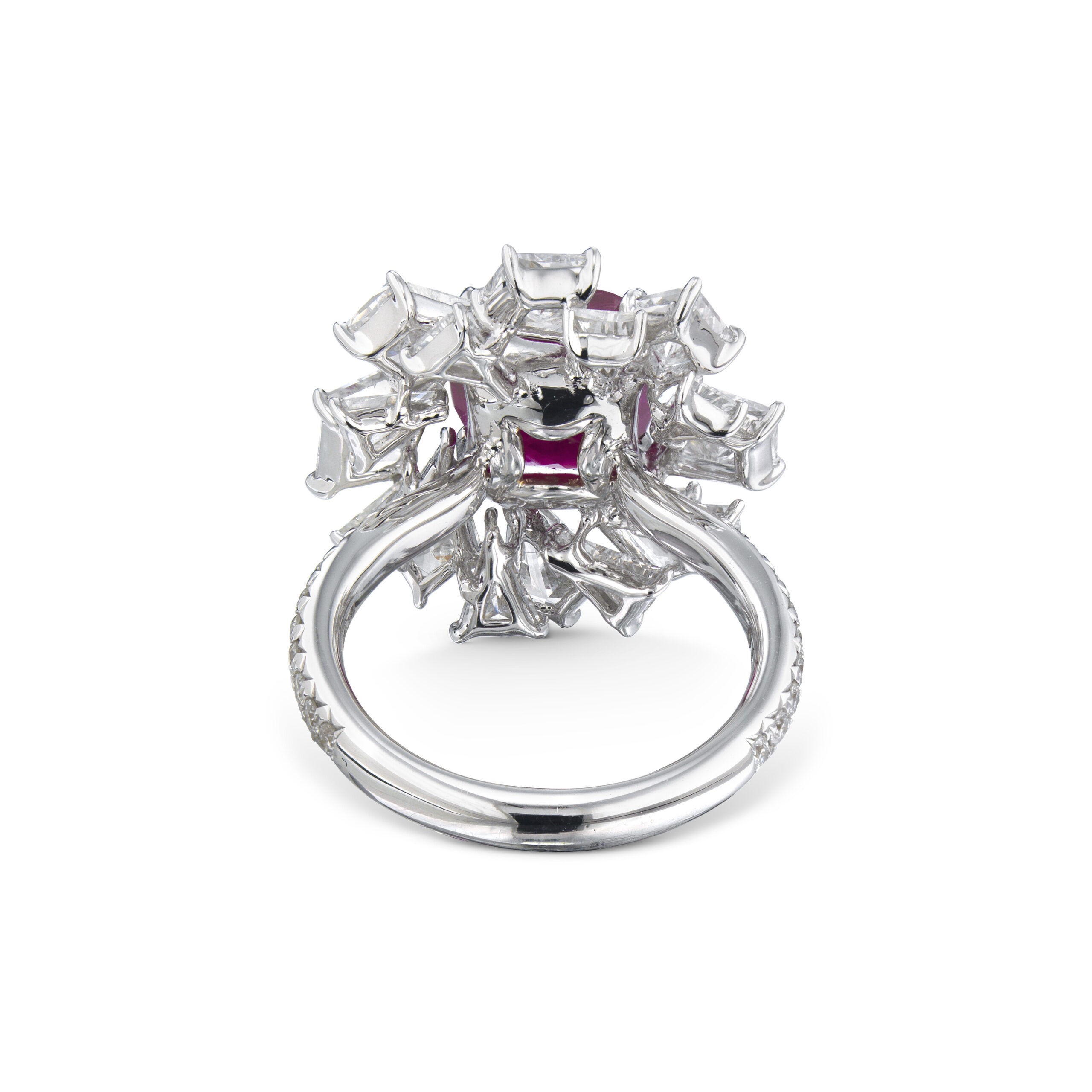 As the ring moves through different lighting, you see how precisely the diamonds and gemstones have been tuned to one another. The approximately 4.34 carats of Ruby Red oval diamonds share a common rhythm of fire and brilliance, so the light seems to roll smoothly along the row rather than jumping abruptly between them.