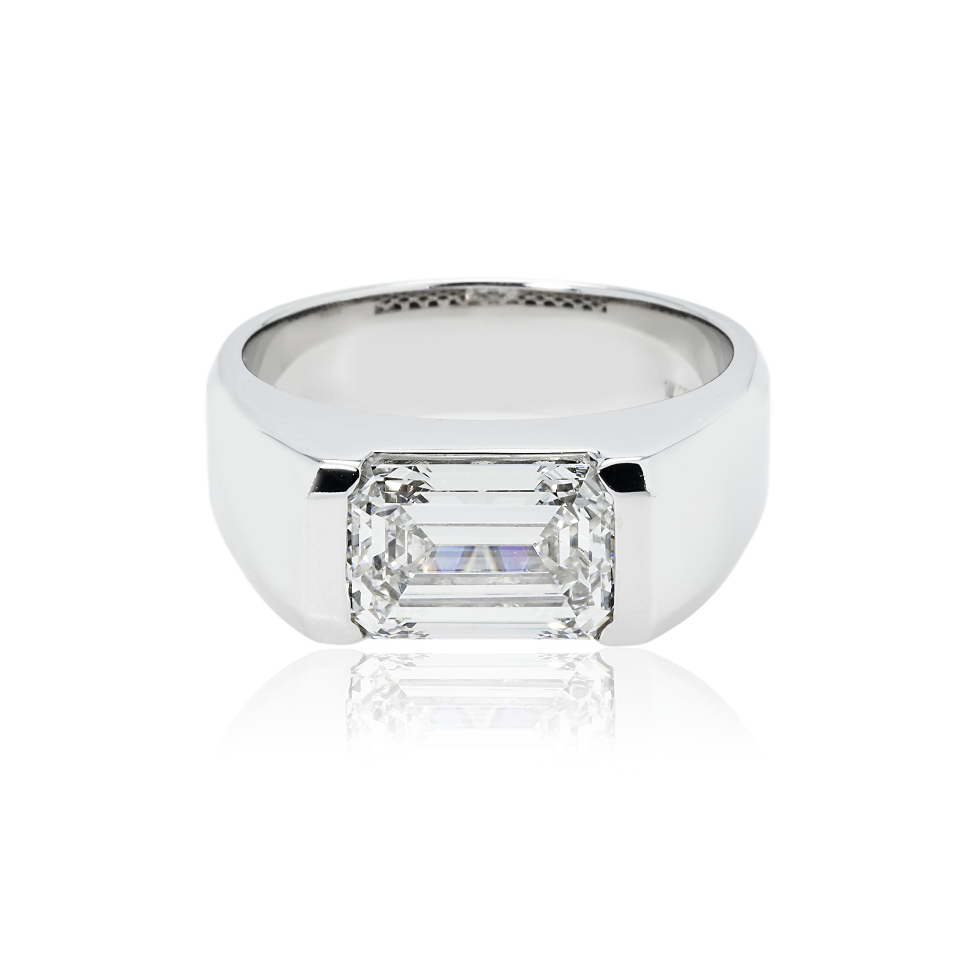 Viewed from any angle, the approximately Carat weight on request of Emerald Green Emerald cut diamonds create a wide field of brilliance across the finger. The carat weight is generous enough to be unmistakable in a room, yet balanced so that the ring never feels overpowering.