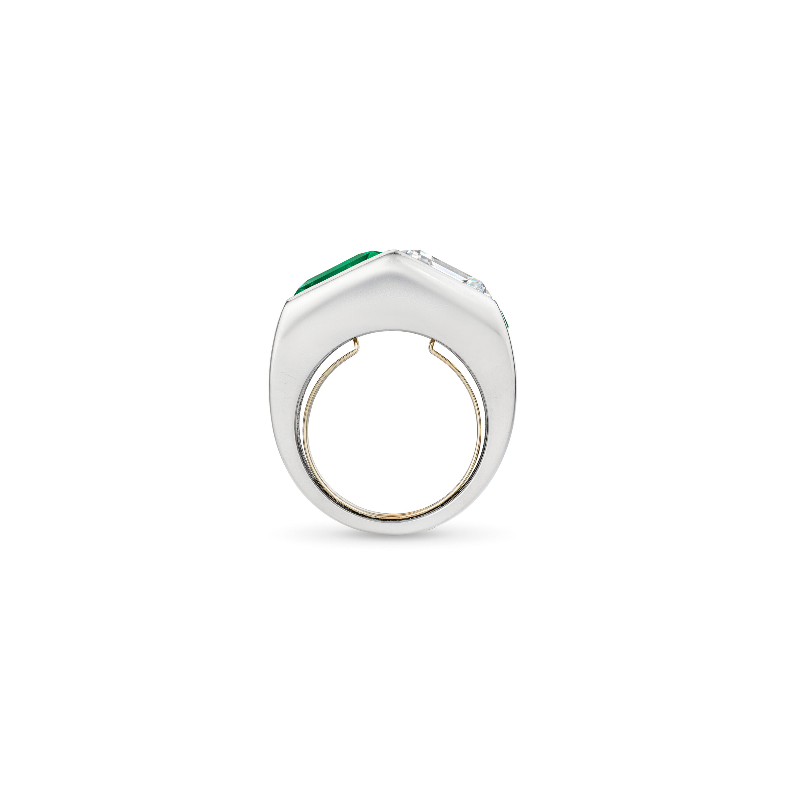 As the ring moves through different lighting, you see how precisely the diamonds and gemstones have been tuned to one another. The approximately 4 carats of Emerald Green Emerald cut diamonds share a common rhythm of fire and brilliance, so the light seems to roll smoothly along the row rather than jumping abruptly between them.