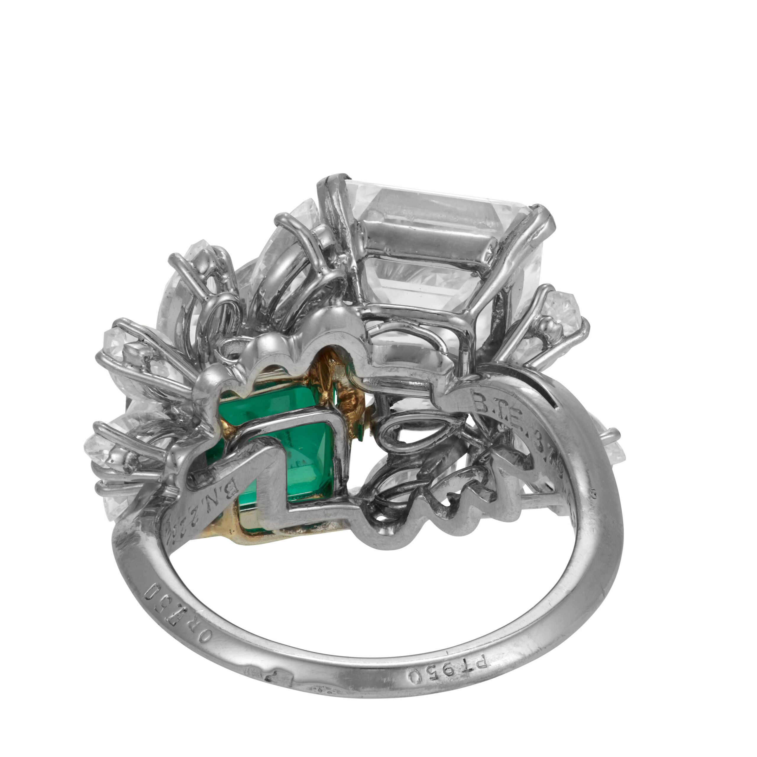 As the ring moves through different lighting, you see how precisely the diamonds and gemstones have been tuned to one another. The approximately 4 carats of Emerald Green Emerald cut diamonds share a common rhythm of fire and brilliance, so the light seems to roll smoothly along the row rather than jumping abruptly between them.