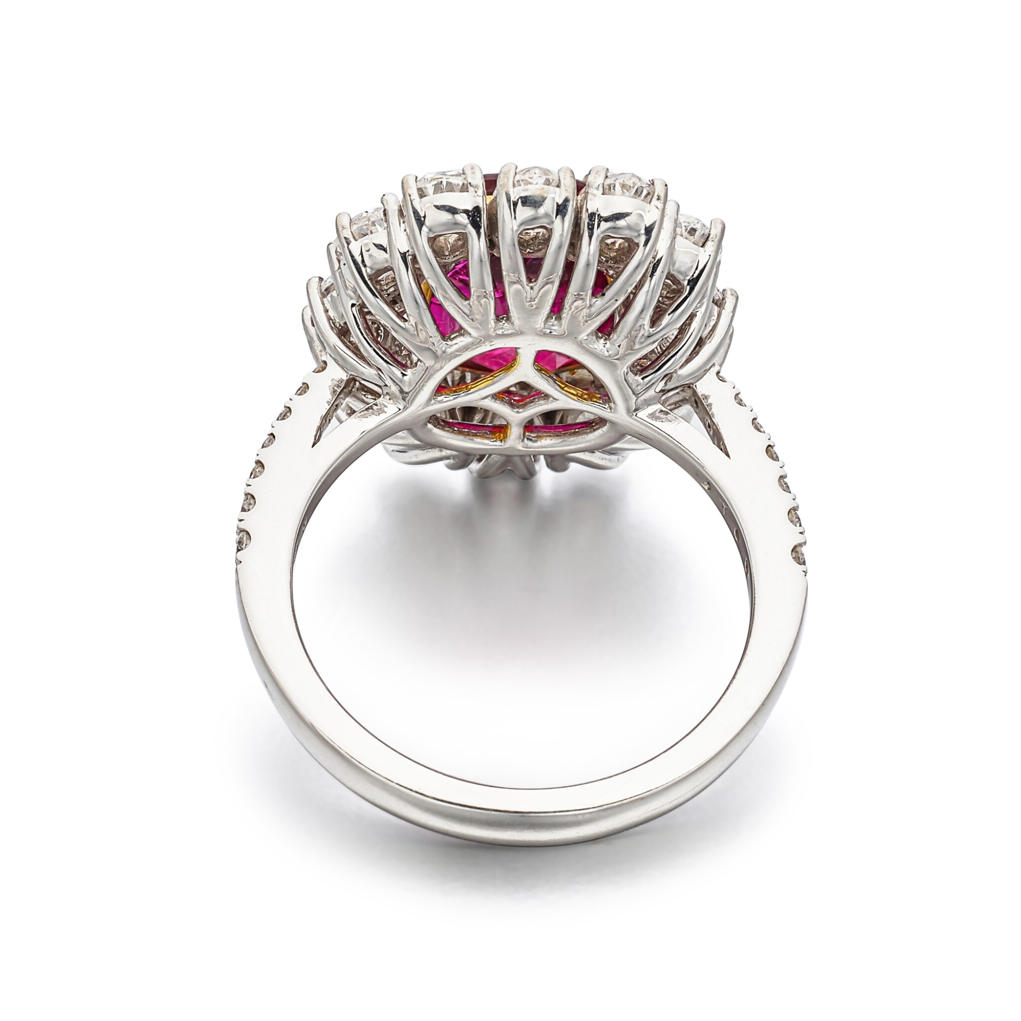 To preserve the calm, continuous light of the Ruby Red diamonds and gemstones, we suggest adopting a simple ritual: ring on last when dressing, ring off first when you return. Perfume, hair products and lotions should be applied before you wear the ring so residue does not build up on the stones or 14K White Gold surfaces.