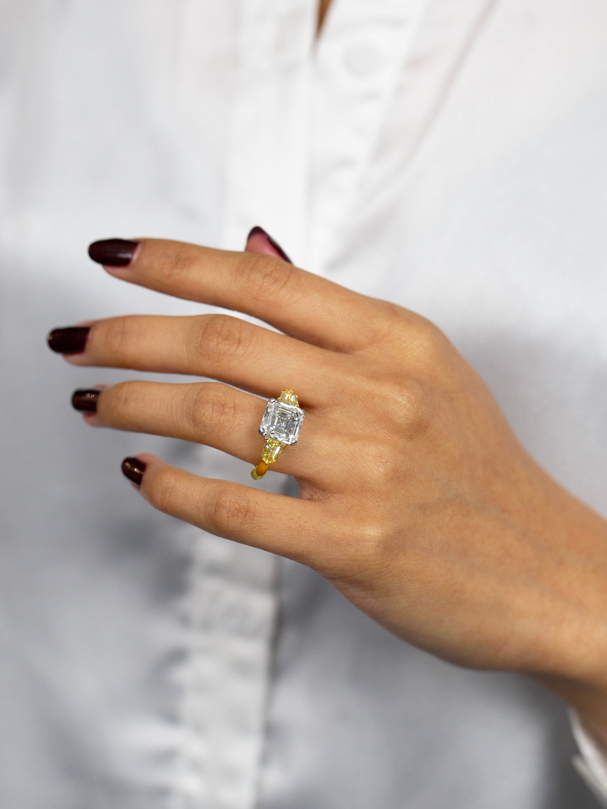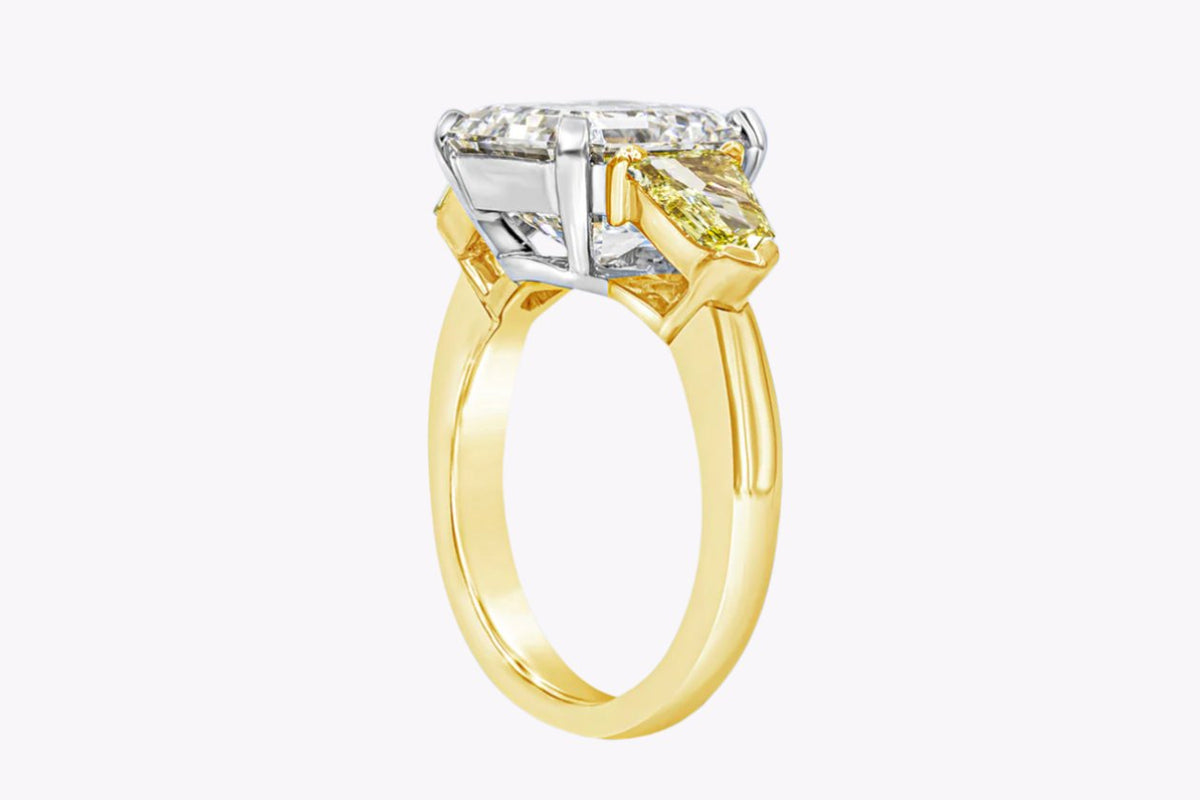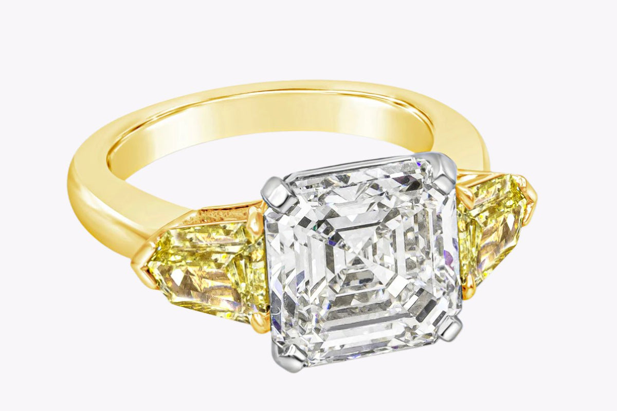 The presence of Asscher diamonds in this Fancy Yellow palette gives the ring a calm, confident radiance that transcends trend and season.