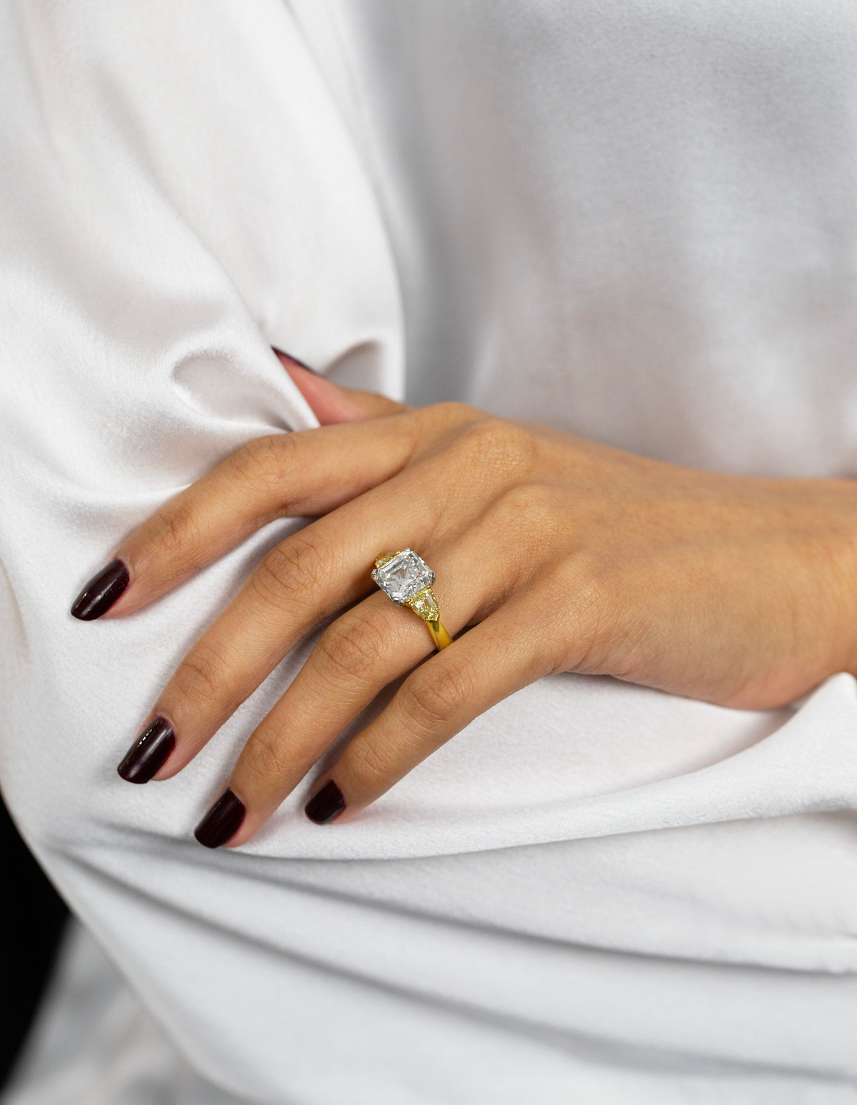 On the hand, this 5.05 carats Fancy Yellow Three-Stone Ring is best treated as a focal point. For daytime, let the fancy colour diamonds lead against clean tailoring β crisp shirts, structured blazers and knitwear in neutral tones allow the Asscher line to read clearly without visual noise.