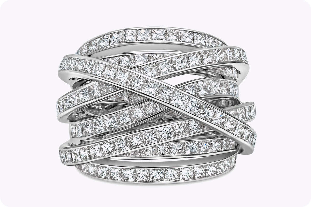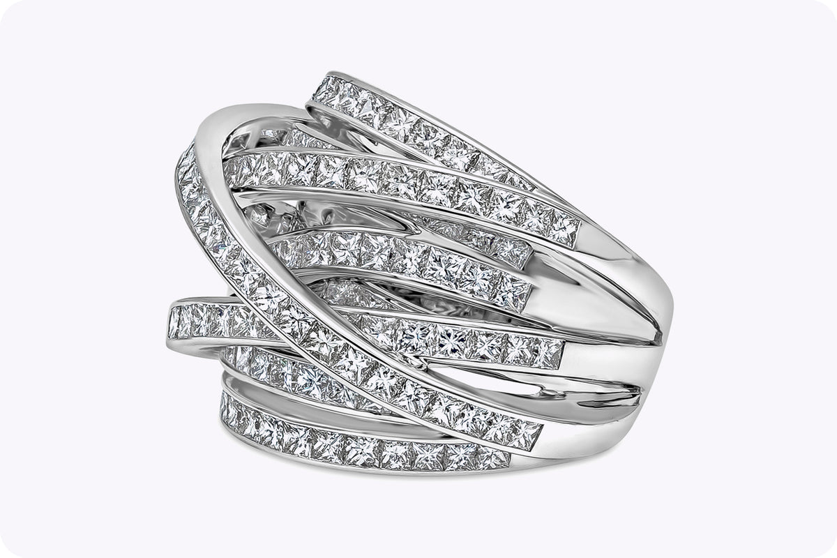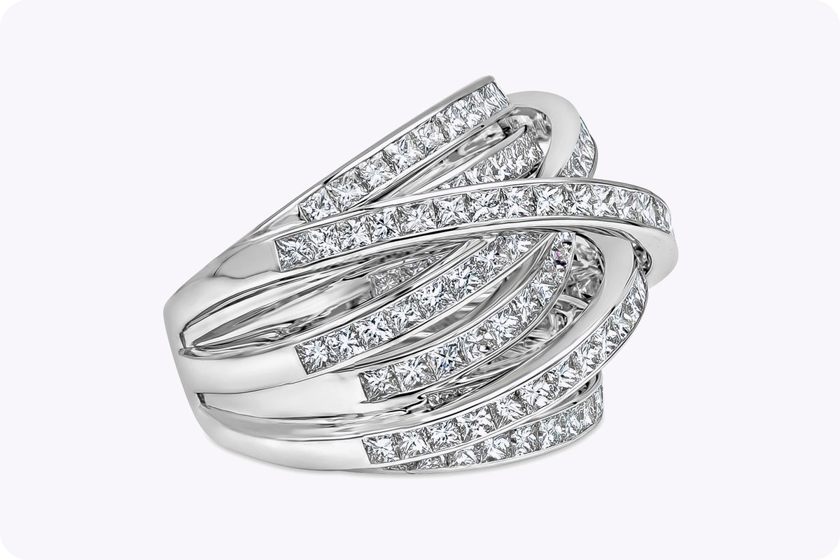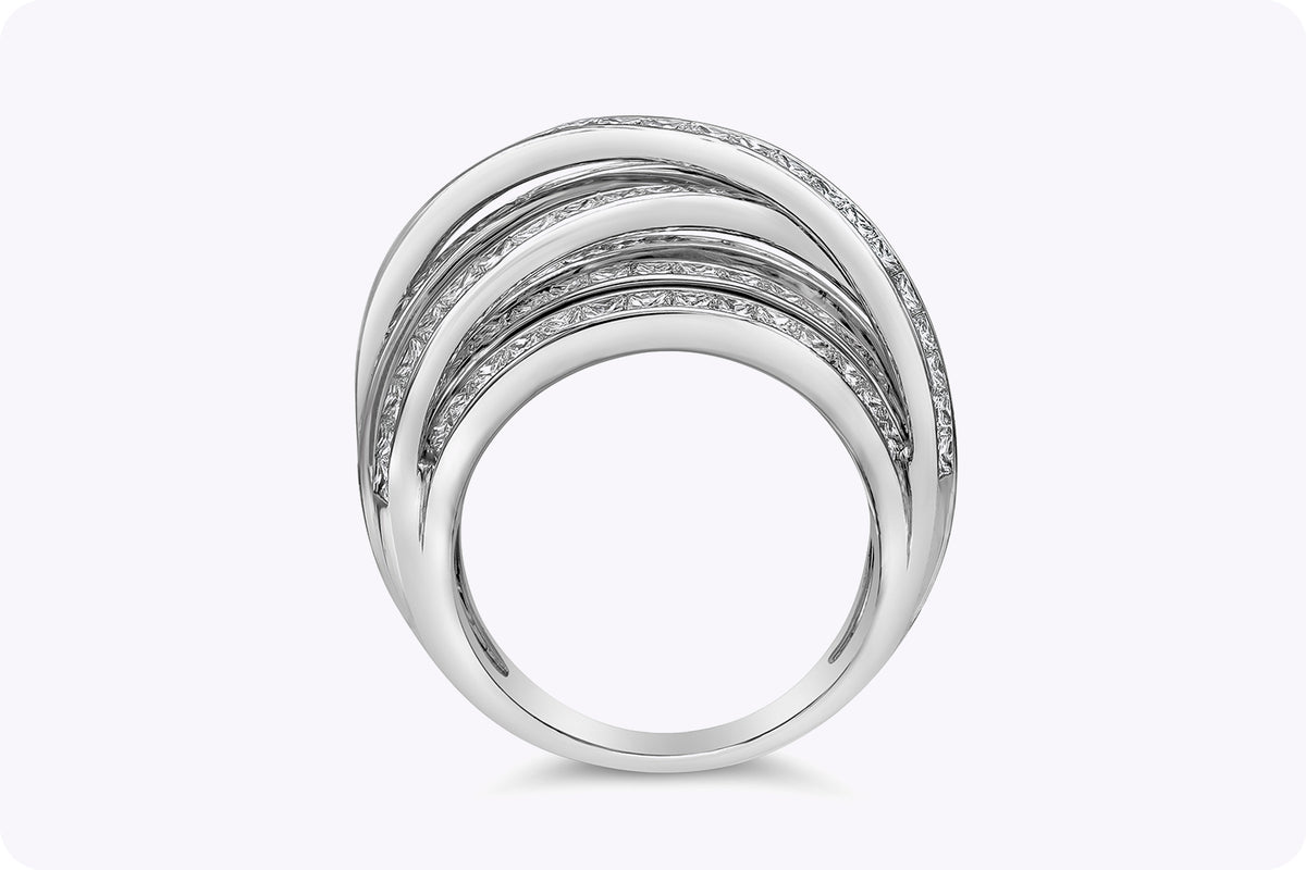 Approximately 5.1 carats, princess, statement ring, diamond ring. Built for clients who judge a ring in motion, not only in perfect studio light. Colour family: Brilliant White. Metal: 14K White Gold. The setting prioritises stability and comfort, so the diamonds sit securely while keeping light open across the surface. It feels substantial on the hand, yet remains practical enough to be worn often rather than stored away. Ideal for boardroom-to-black-tie wear, with a look that stays precise under close scrutiny. Timeless Brillianceβa piece defined by brilliance, poise, and longevity.