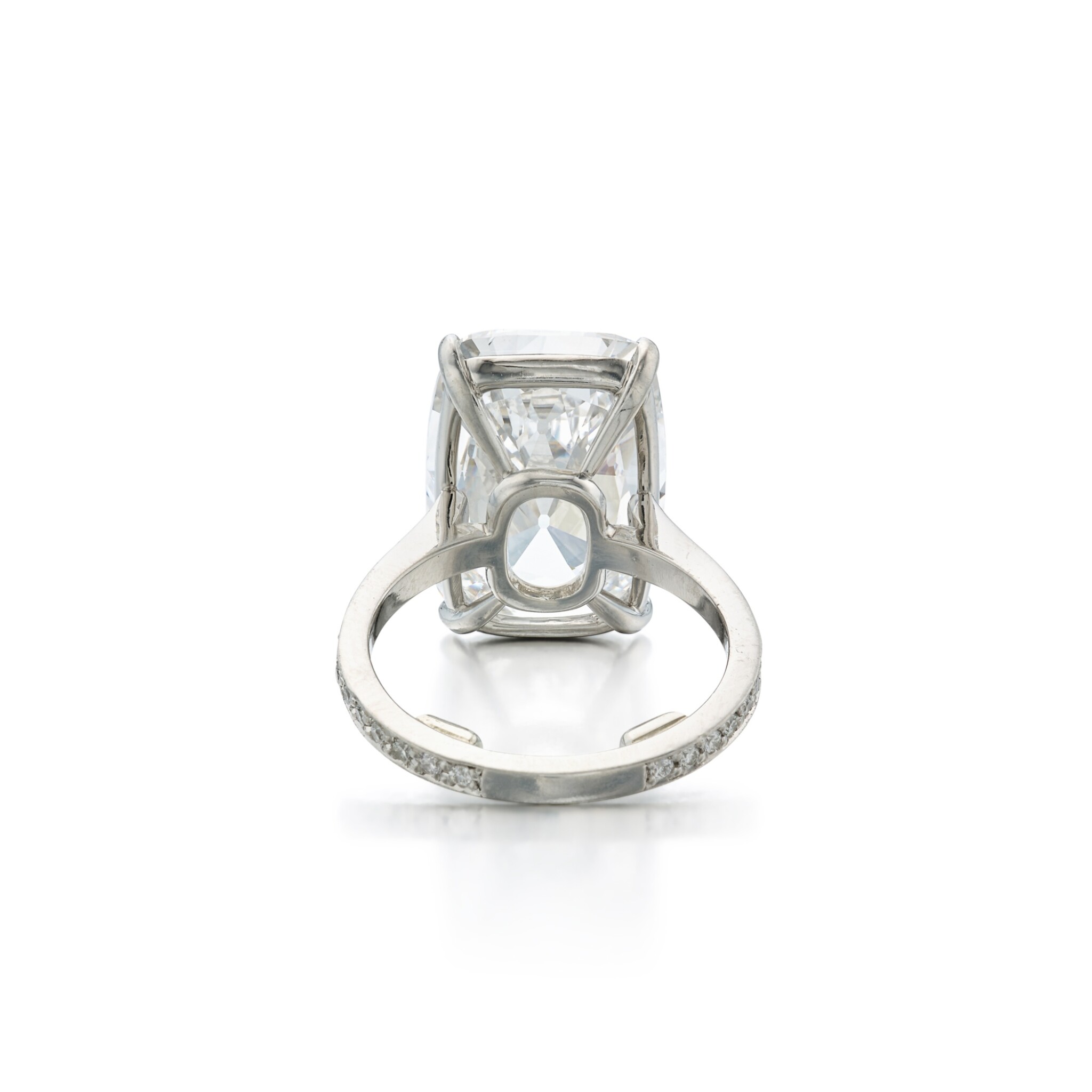 Viewed from the side as well as from above, the architecture reveals how carefully the diamonds are staged. The approximately 5 carats of Brilliant White Cushion cut diamonds are set at slightly graduated heights and tilts so they catch and return light to the viewer from multiple directions.