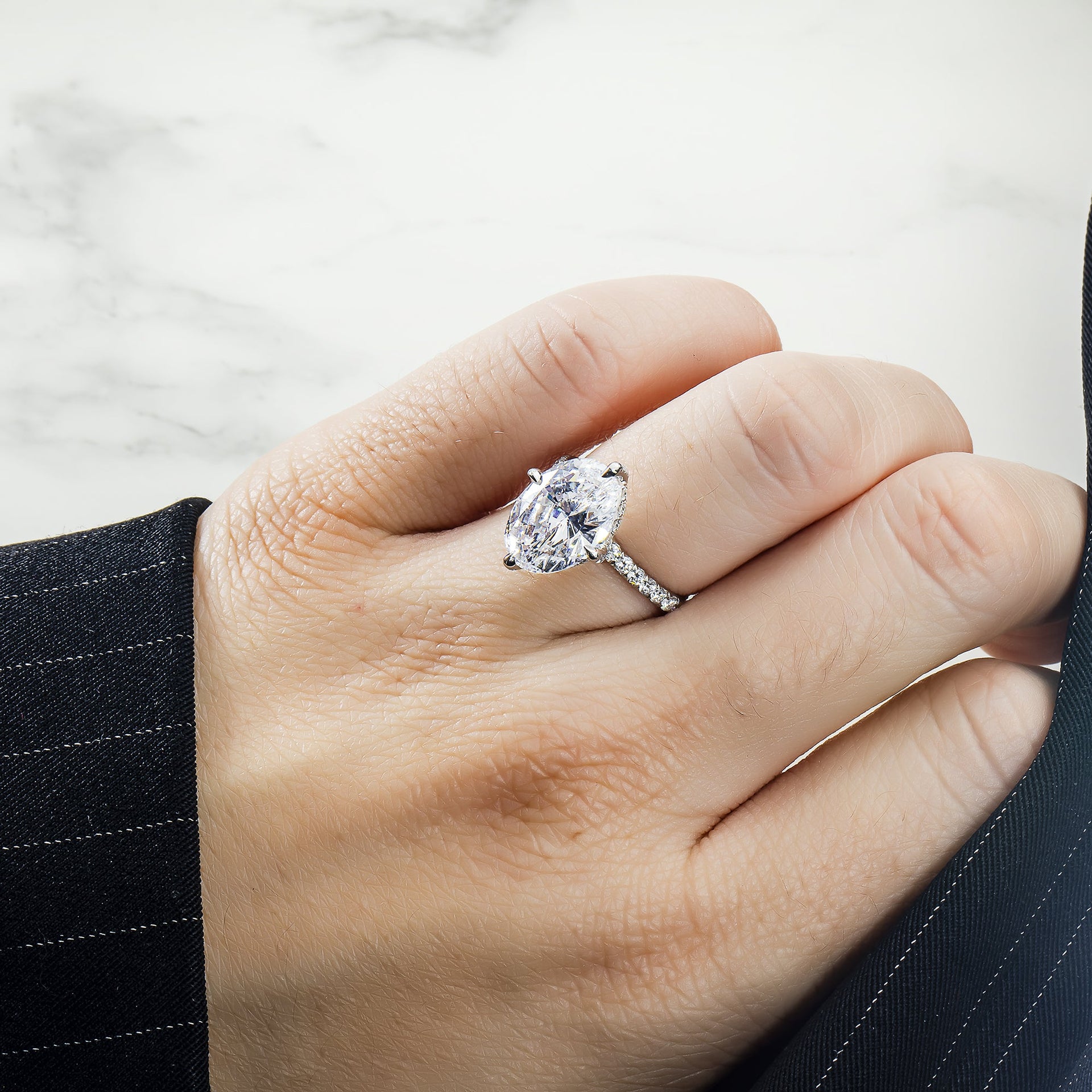 From a styling perspective, the strength of this design lies in its clarity: a disciplined row of Oval diamonds, a focused 5 carats of Brilliant White light and a considered Engagement Ring profile. In everyday use, that means you can keep everything else quiet and still feel fully dressed β a single bracelet, a classic pair of earrings and perhaps one additional ring are more than enough.