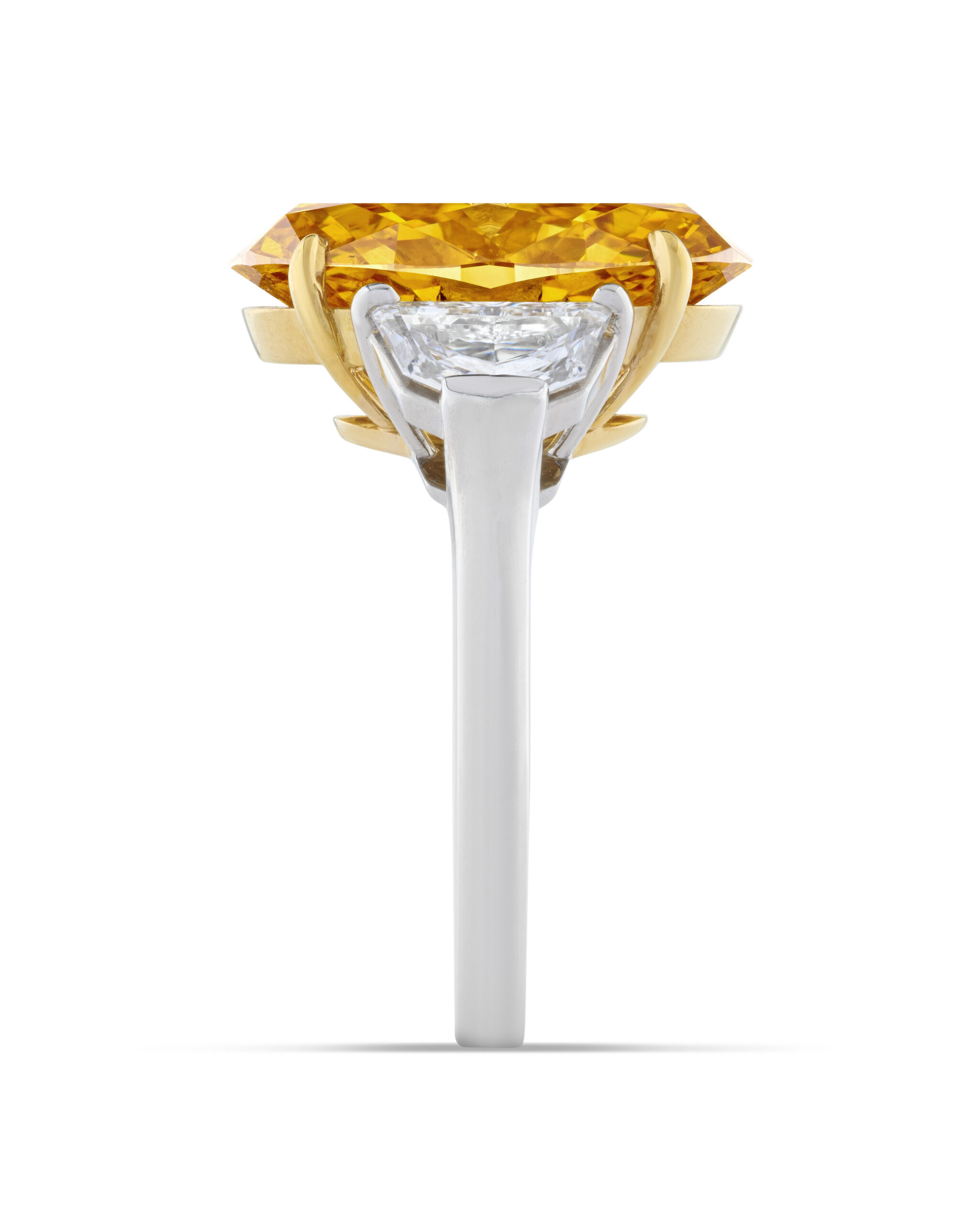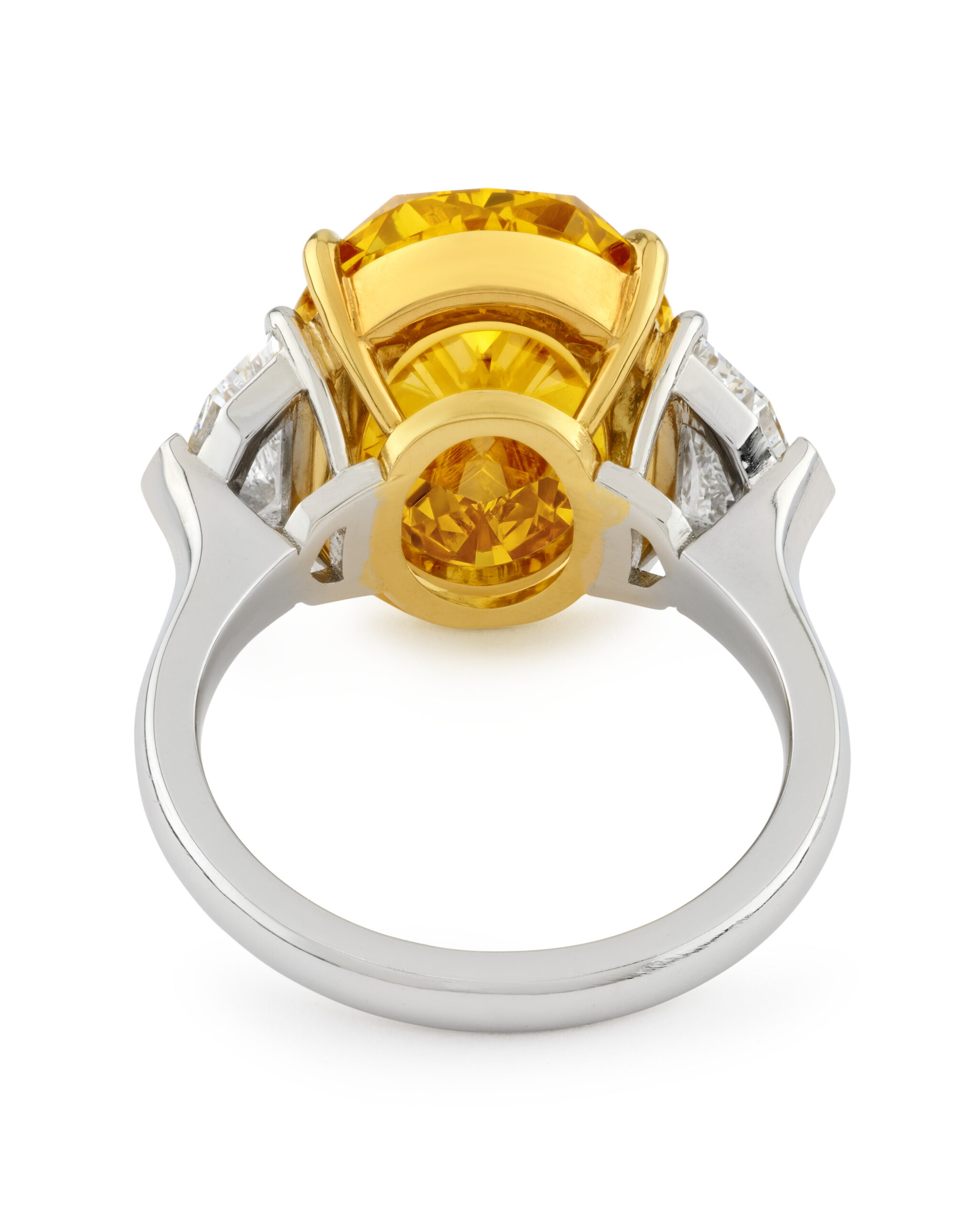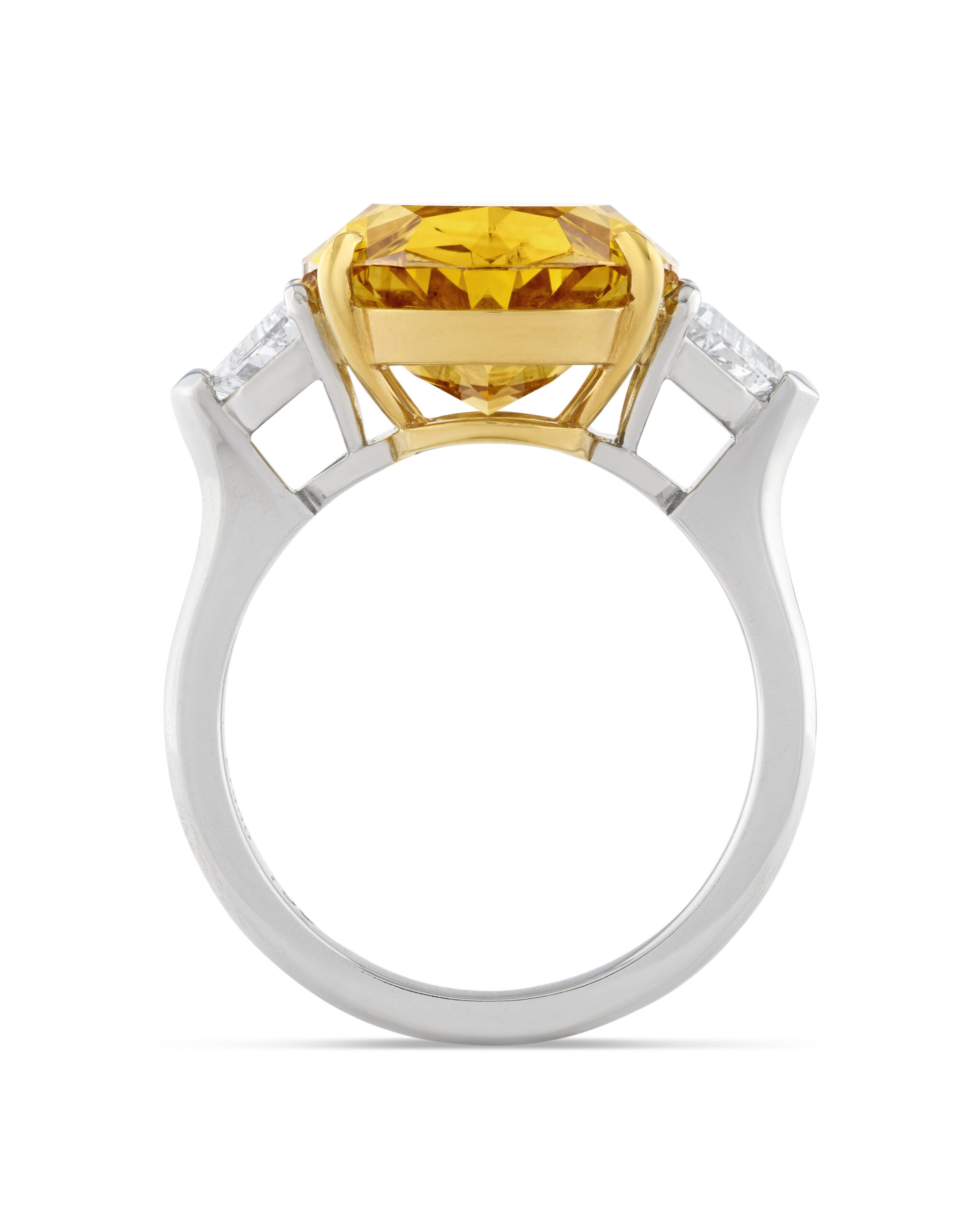 Think of this ring as a piece that edits, rather than complicates, your look. The clean line of the Oval stones and the concentrated 5 carats of Fancy Yellow diamonds reward simple, architectural clothing – column dresses, precise blazers, cashmere knits and well-cut denim all give it room to breathe.