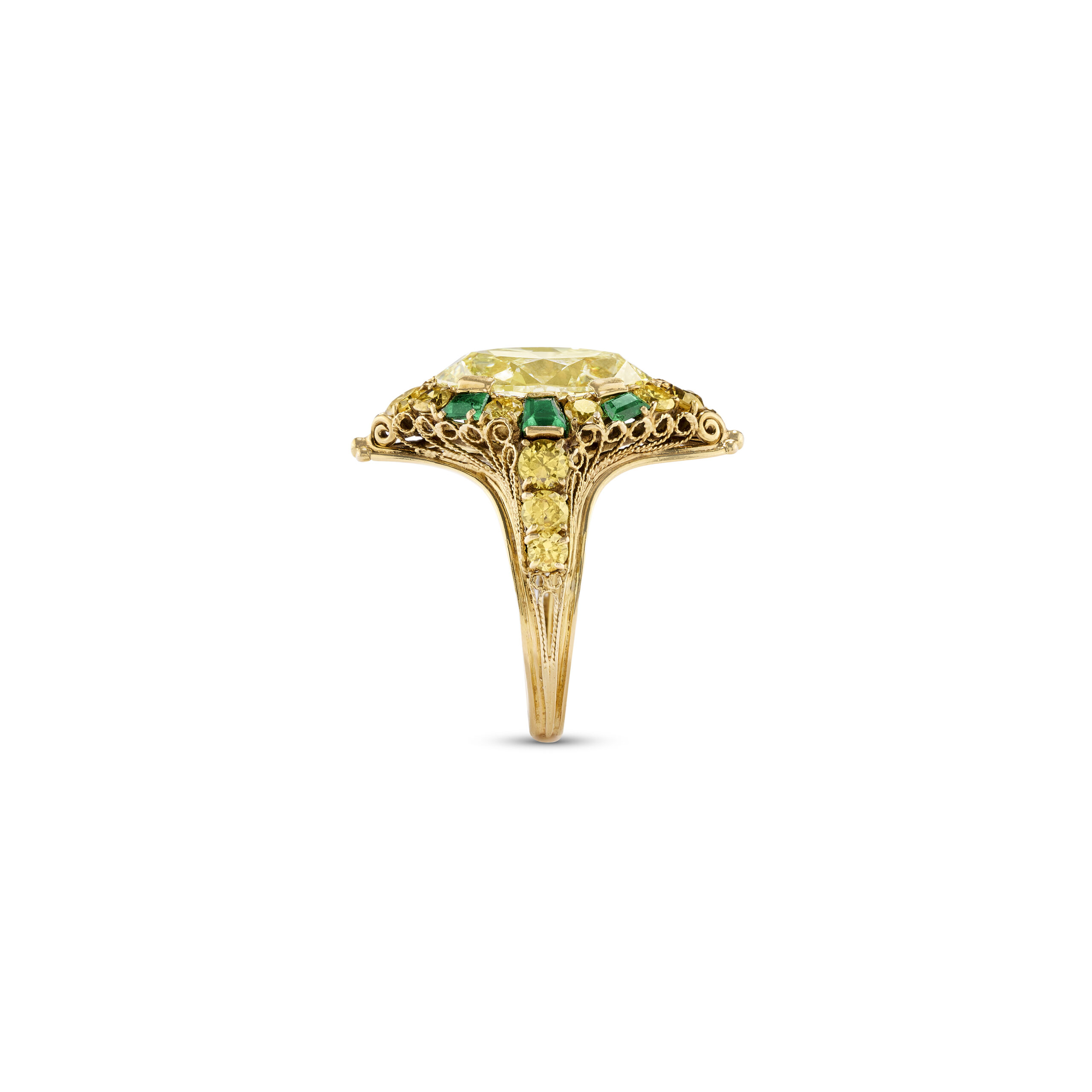 Inspired by the great high jewelry rings seen on red carpets and at state dinners, this Legacy creation showcases approximately 5 carats of Fancy Yellow oval diamonds in a deliberately timeless profile.
