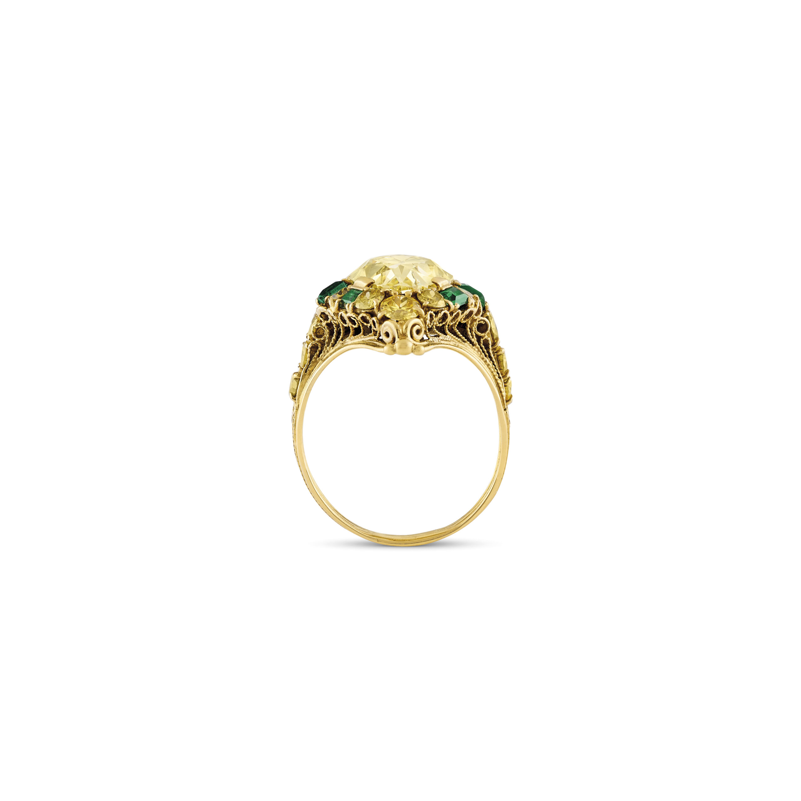 Everyday brilliance is easiest to maintain when the ring is kept free from invisible films of cream, sunscreen and fragrance. Wipe the Fancy Yellow diamonds gently with a lint-free cloth at the end of the day, then rest the ring in its own pouch or box rather than loose in a jewellery tray.
