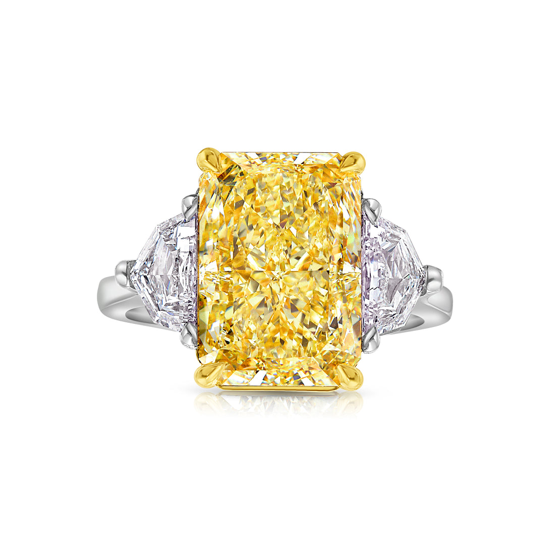 Viewed from the side as well as from above, the architecture reveals how carefully the fancy colour diamonds are staged. The approximately 5 carats of Fancy Yellow Radiant cut diamonds are set at slightly graduated heights and tilts so they catch and return light to the viewer from multiple directions.