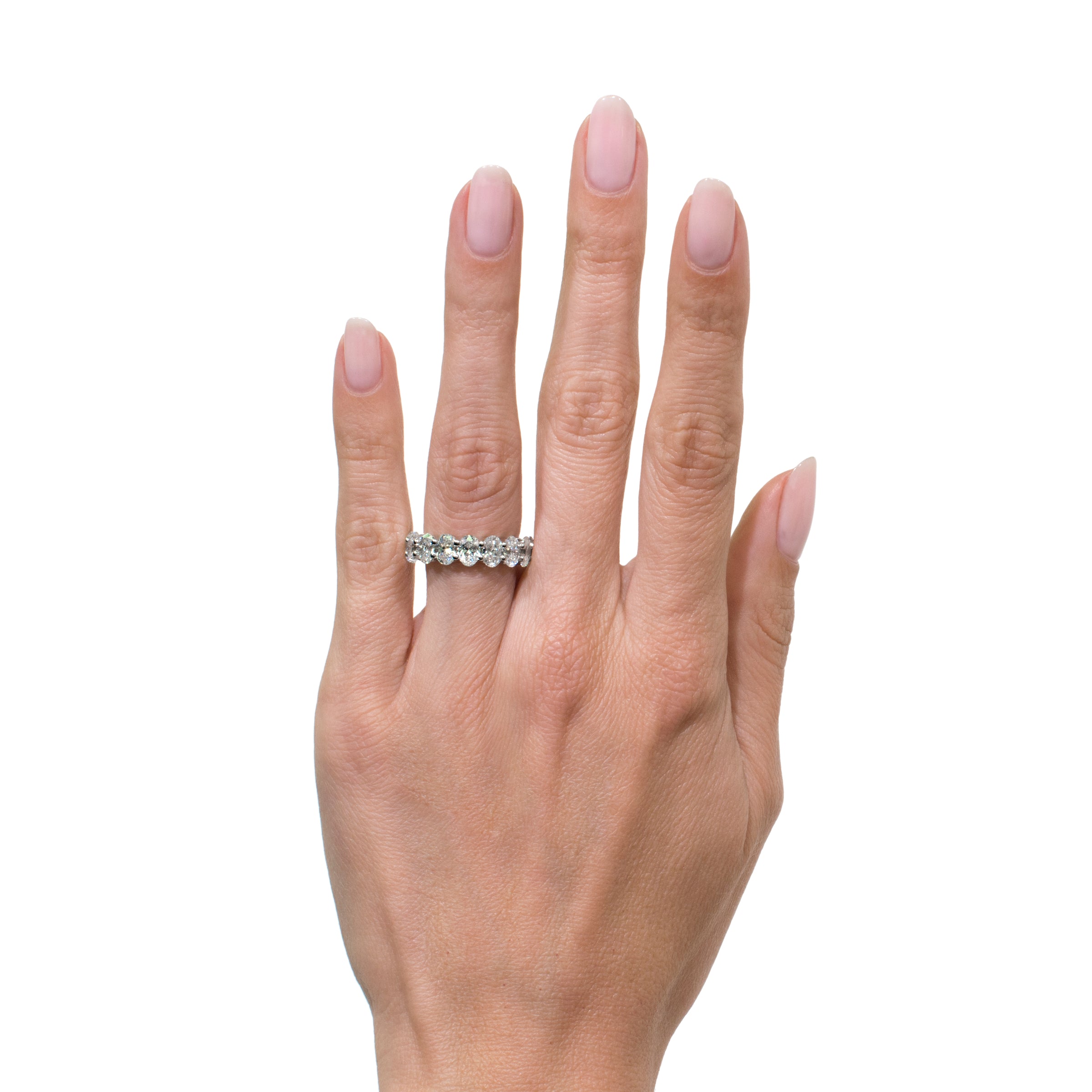 From a styling perspective, the strength of this design lies in its clarity: a disciplined row of Oval diamonds, a focused 6.45 carats of Brilliant White light and a considered Wedding Band profile. In everyday use, that means you can keep everything else quiet and still feel fully dressed β a single bracelet, a classic pair of earrings and perhaps one additional ring are more than enough.