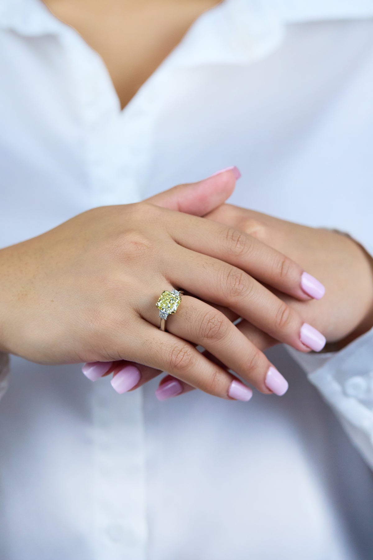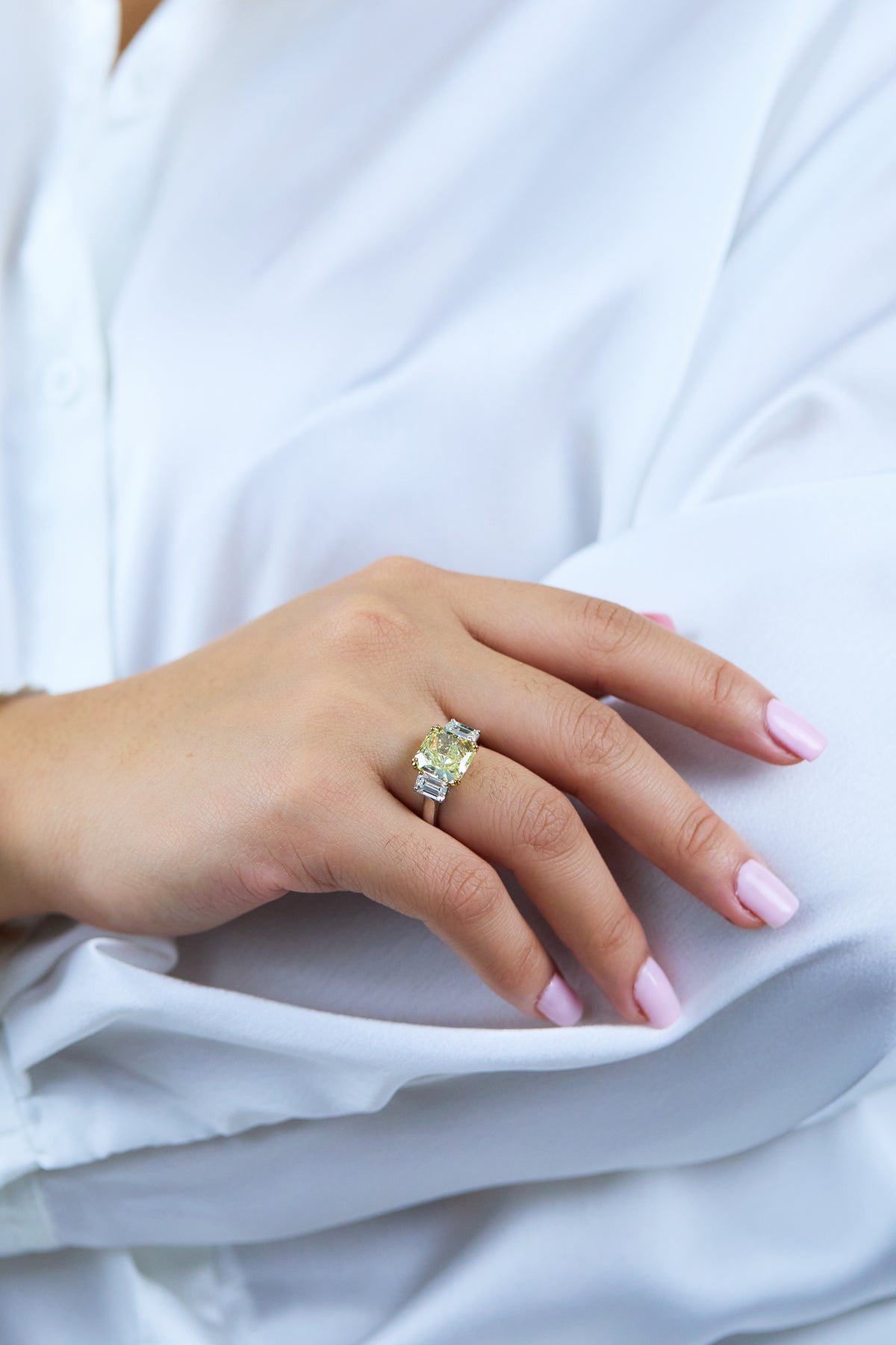 Clients who favour quiet power often wear this 6.54 carats Fancy Yellow diamonds ring as their one definitive piece. In that mode, it pairs beautifully with monochrome ensembles β black, white, charcoal and midnight blue β so that the Radiant reflections become the brightest element in the room.