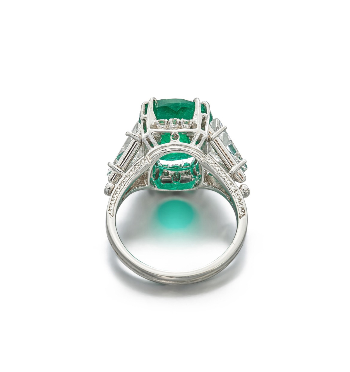 As the ring moves through different lighting, you see how precisely the diamonds and gemstones have been tuned to one another. The approximately 6.63 carats of Emerald Green Emerald cut diamonds share a common rhythm of fire and brilliance, so the light seems to roll smoothly along the row rather than jumping abruptly between them.