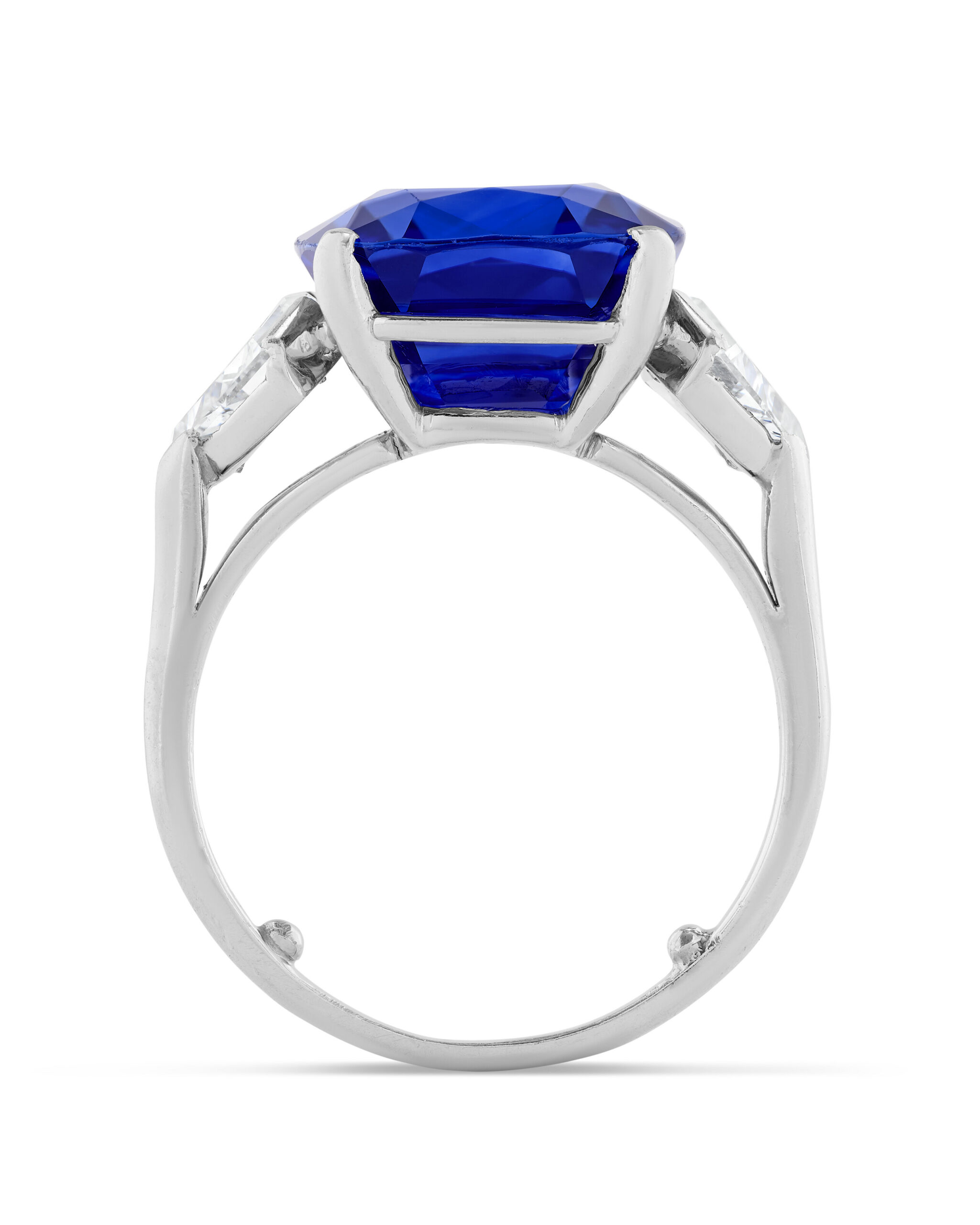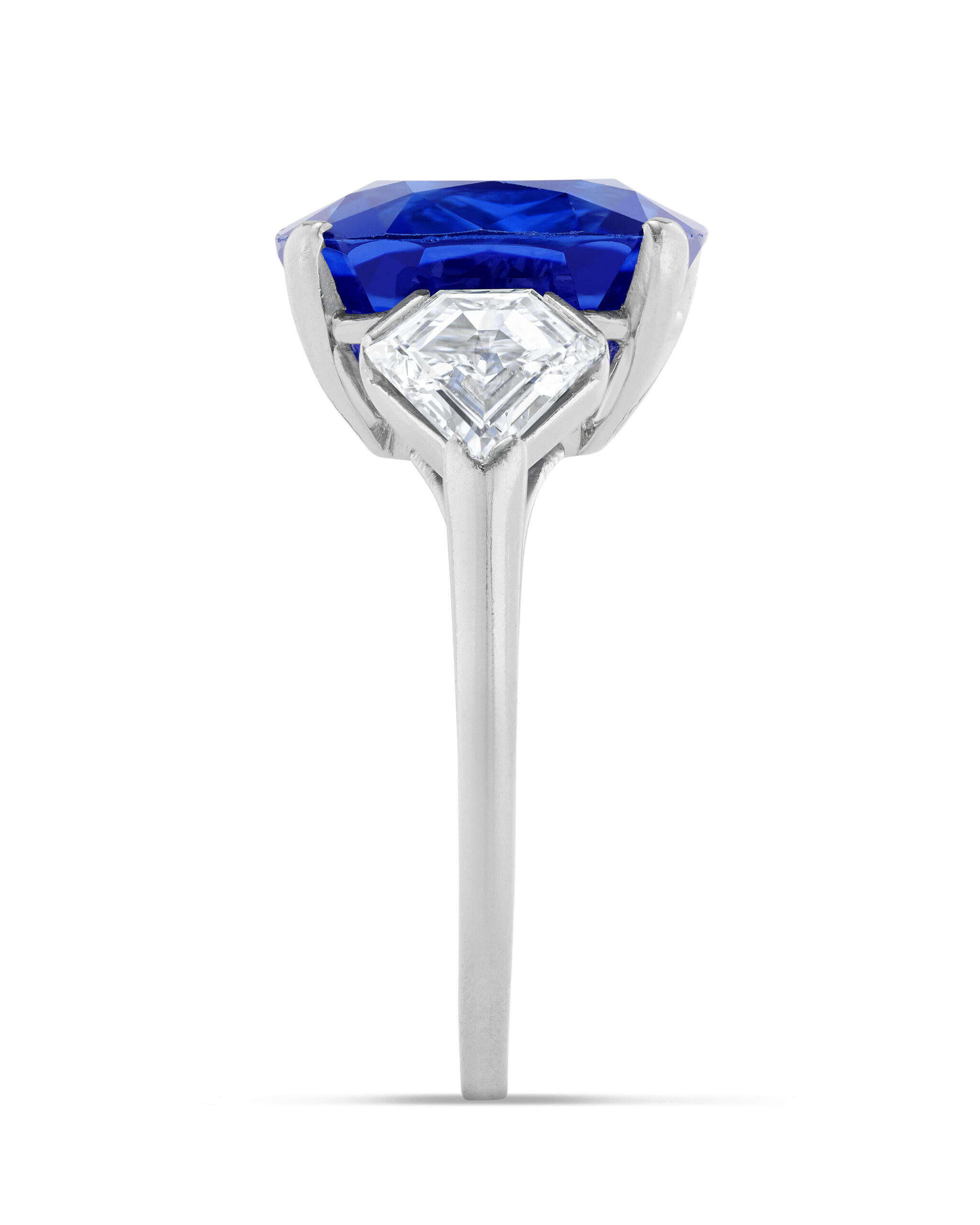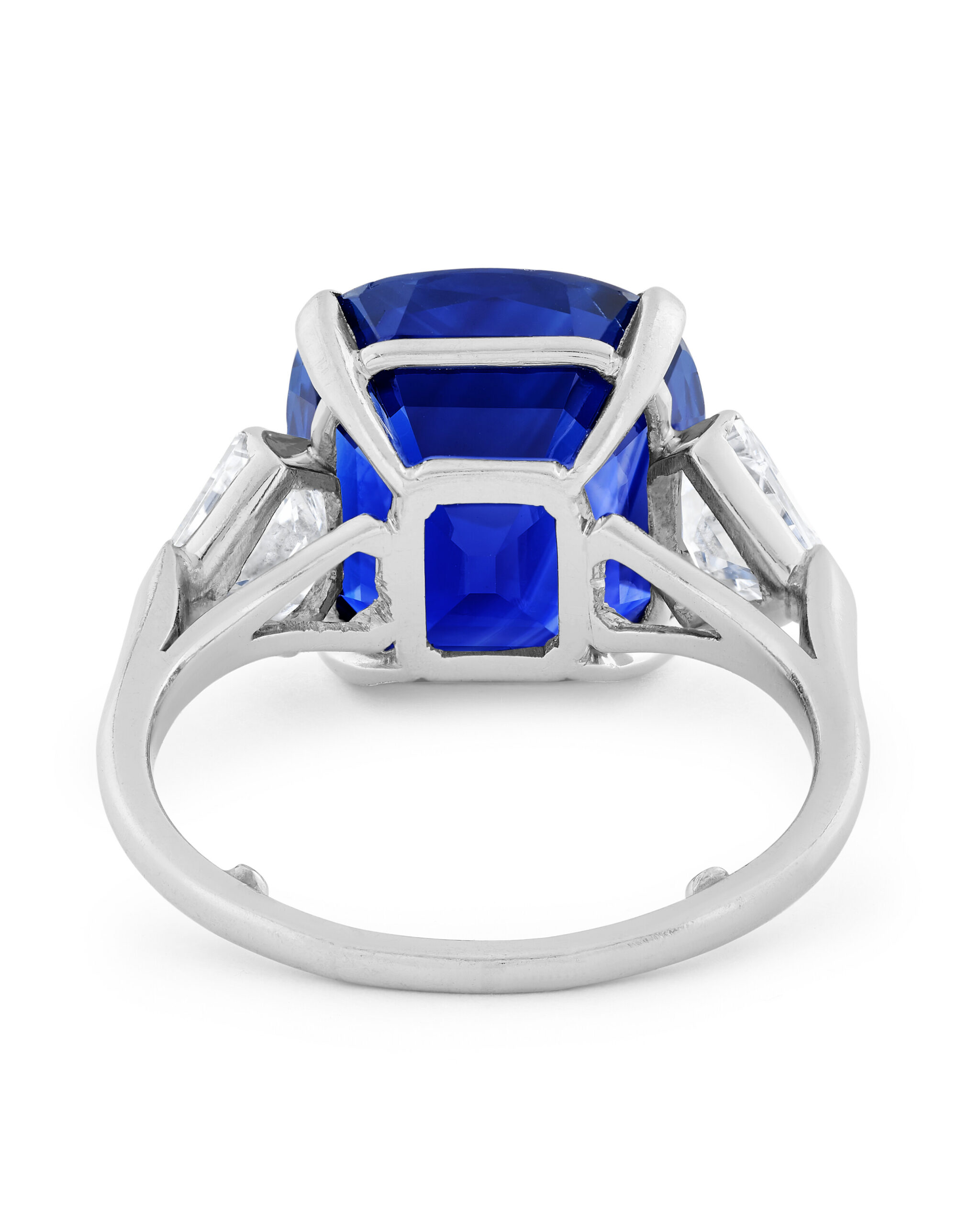 Inspired by the great high jewelry rings seen on red carpets and at state dinners, this Legacy creation showcases approximately 6 carats of Royal Blue Sapphire Cushion cut diamonds in a deliberately timeless profile.