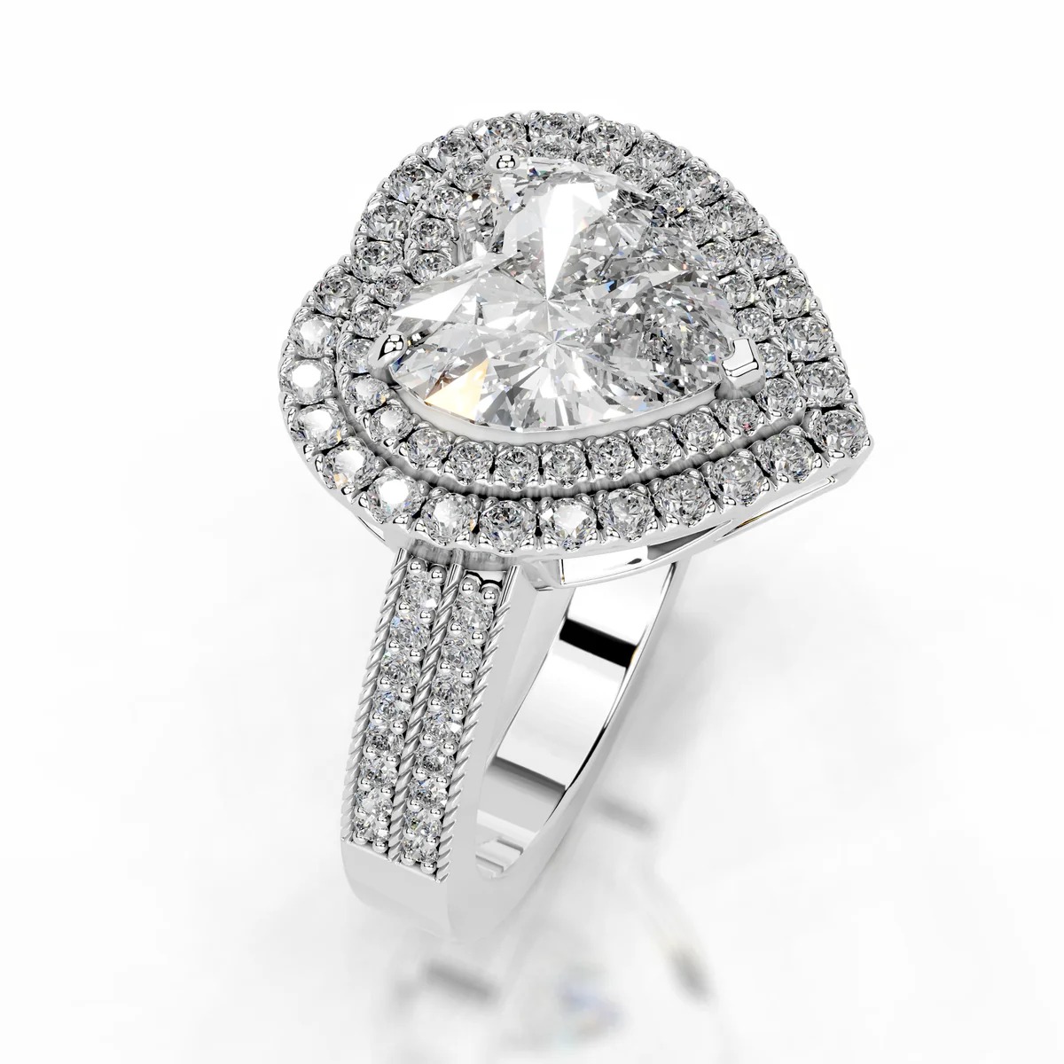 Approximately 6 carats, heart shape, statement ring, diamond ring. A serious diamond ring with disciplined selectionβ€”meant to read clean at normal viewing distance. Colour family: Brilliant White / D color. Clarity: VVS. Metal: 14K White Gold. The setting prioritises stability and comfort, so the diamonds sit securely while keeping light open across the surface. It feels substantial on the hand, yet remains practical enough to be worn often rather than stored away. An enduring asset in jewel form: beautiful to wear, credible to document. Crystal-Clear Grandeurβ€”a piece defined by brilliance, poise, and longevity.