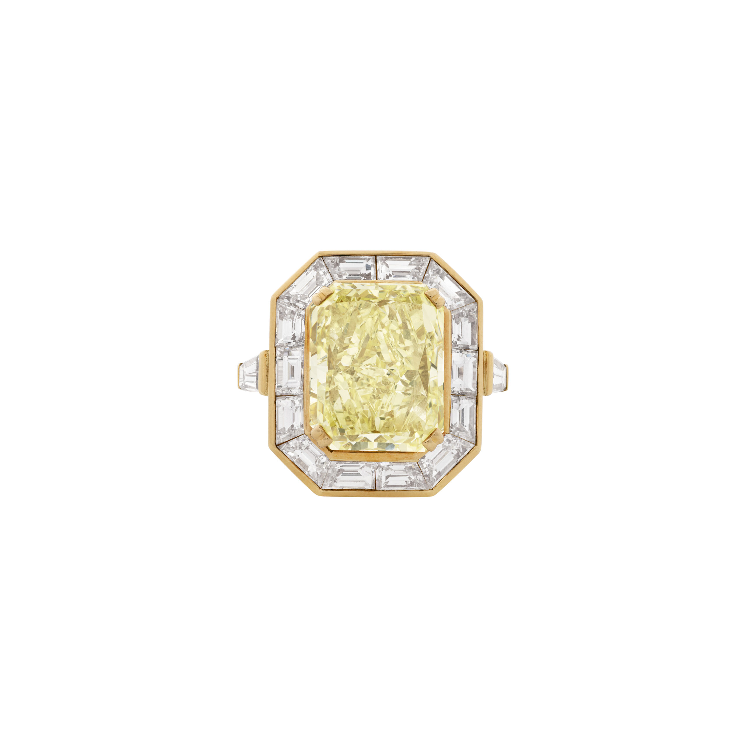 The presence of Radiant cut diamonds in this Fancy Yellow palette gives the ring a calm, confident radiance that transcends trend and season.