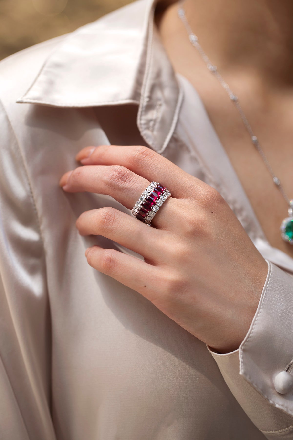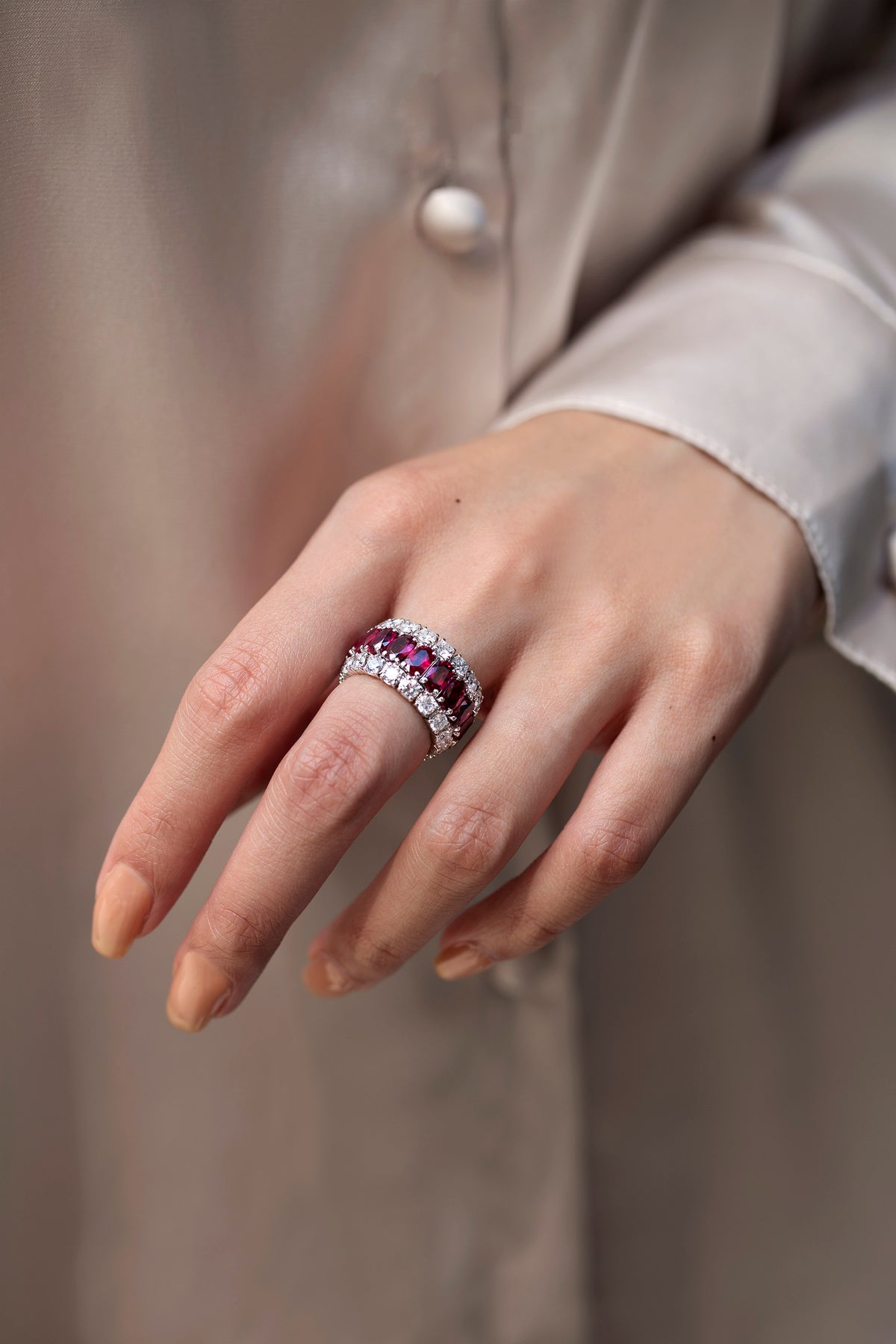 The result is a High Jewelry Statement Ring that holds its own visually – thanks to the Ruby Red palette and approximate 7.54 carats – yet feels effortless to wear all day alongside other treasured pieces.