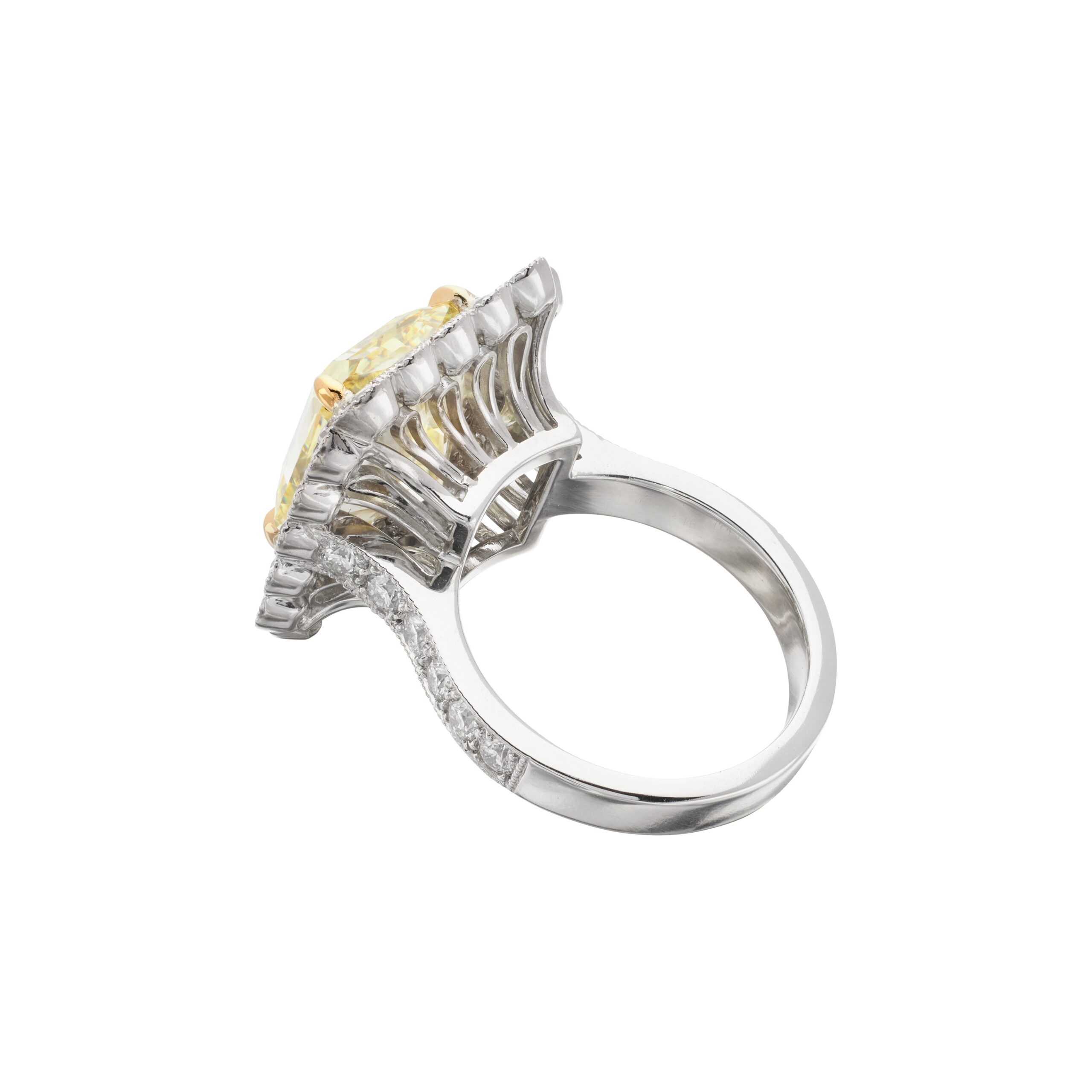 With a total weight of approximately 7.58 carats, this ring delivers immediate visual presence without losing its elegance. The continuous surface of Fancy Yellow light is calibrated so it feels substantial on the hand while remaining comfortable for long hours of wear.