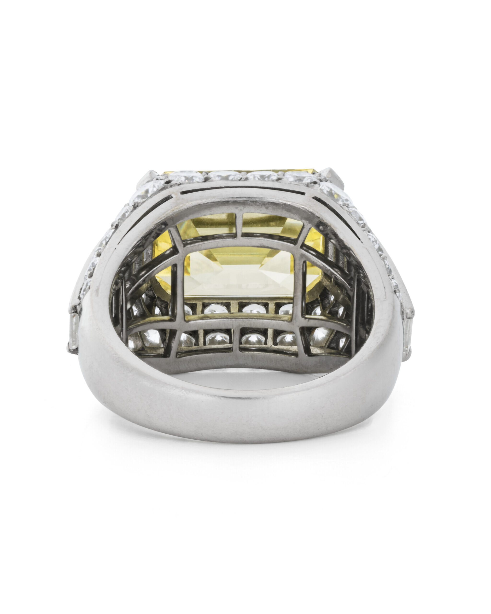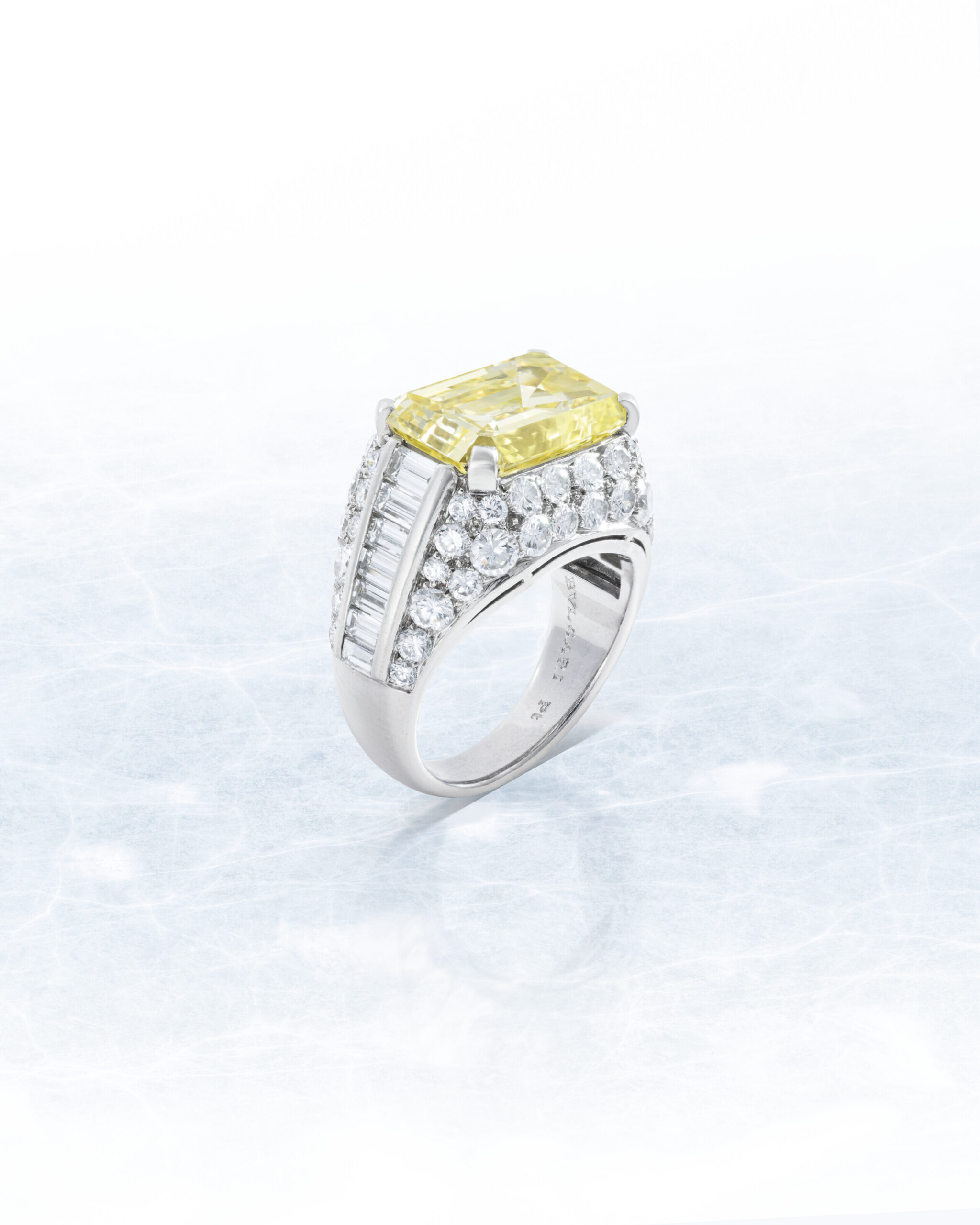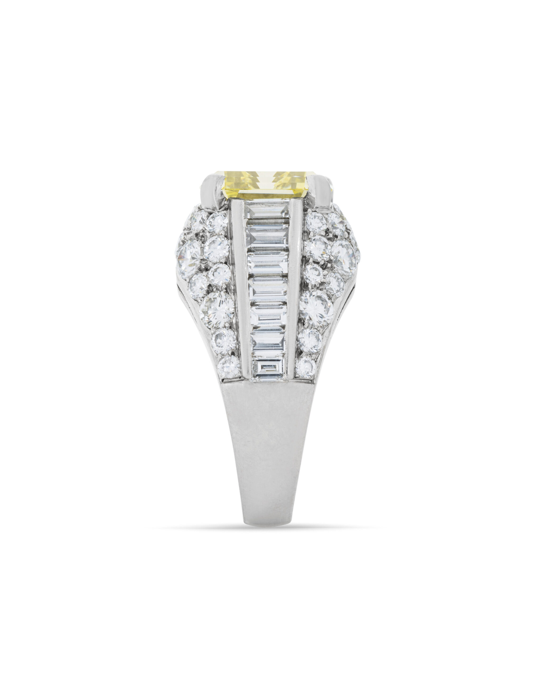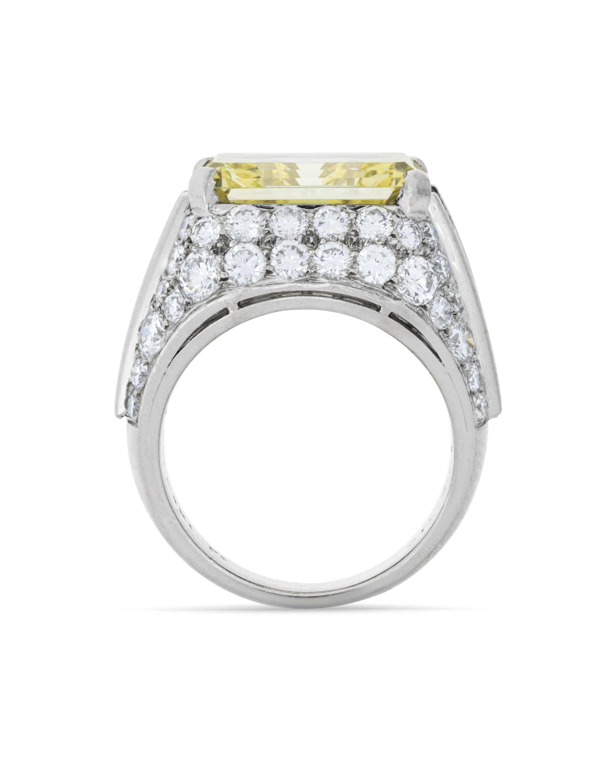 Viewed from the side as well as from above, the architecture reveals how carefully the fancy colour diamonds are staged. The approximately 7 carats of Fancy Yellow Emerald cut diamonds are set at slightly graduated heights and tilts so they catch and return light to the viewer from multiple directions.