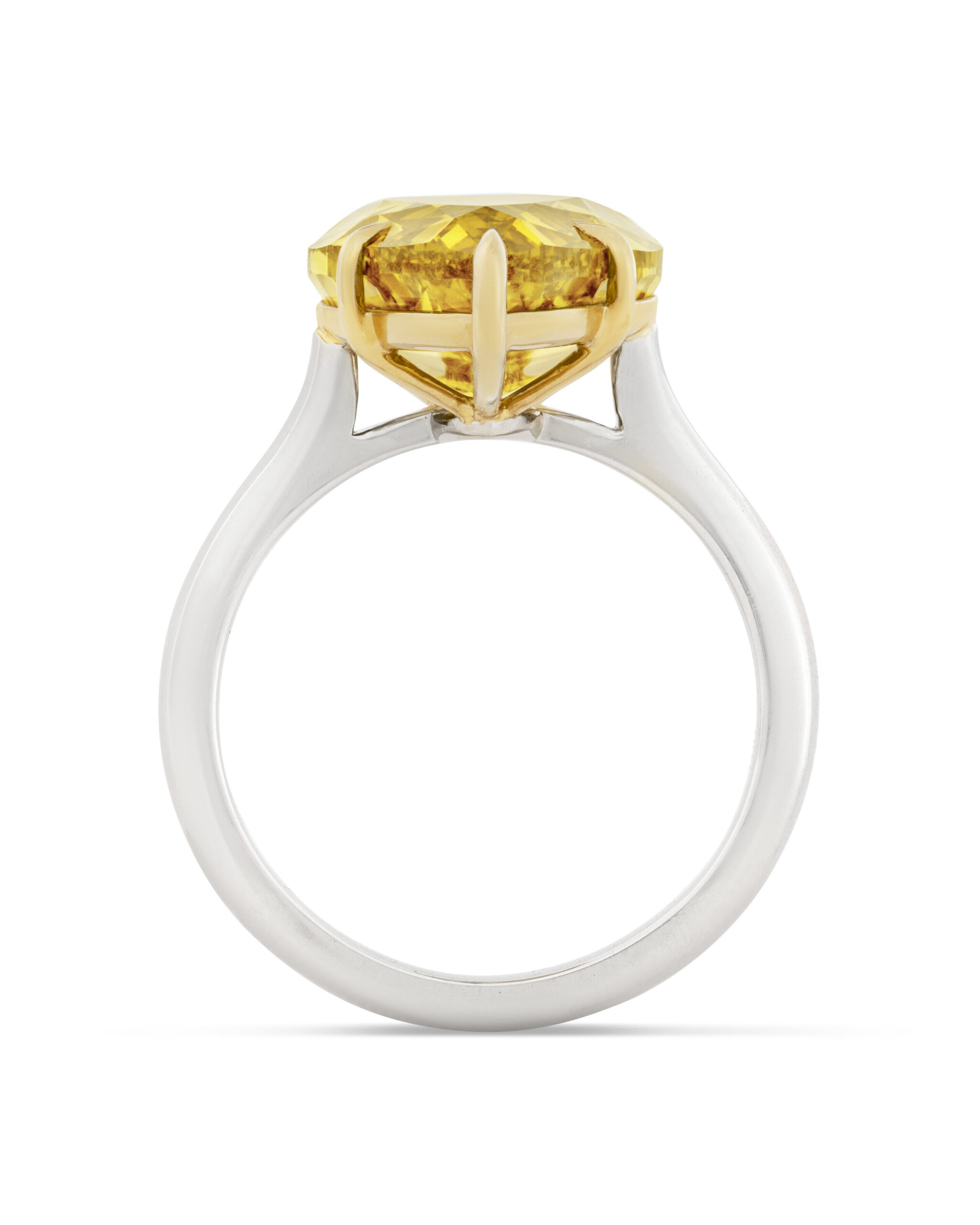 Only then are individual seats cut, claws thinned and contoured, and the inner band shaped to follow the hand’s natural curve, so approximately 7 carats of Fancy Yellow brilliance feels calm, centred and secure. It is this combination of invisible engineering and visible ease that marks the piece as true high jewelry rather than simple ornament.