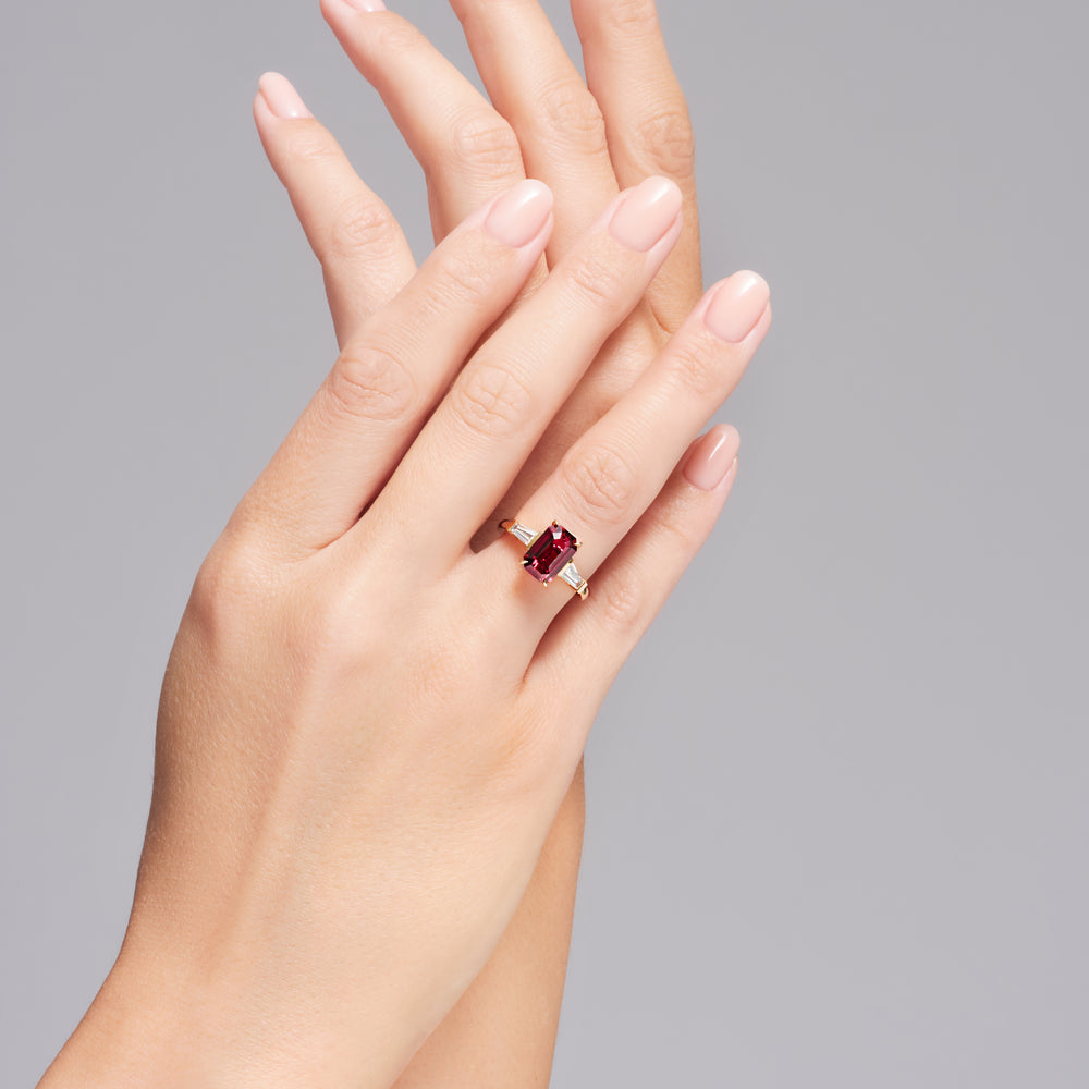 To preserve the calm, continuous light of the Ruby Red diamonds and gemstones, we suggest adopting a simple ritual: ring on last when dressing, ring off first when you return. Perfume, hair products and lotions should be applied before you wear the ring so residue does not build up on the stones or 18K Yellow Gold surfaces.