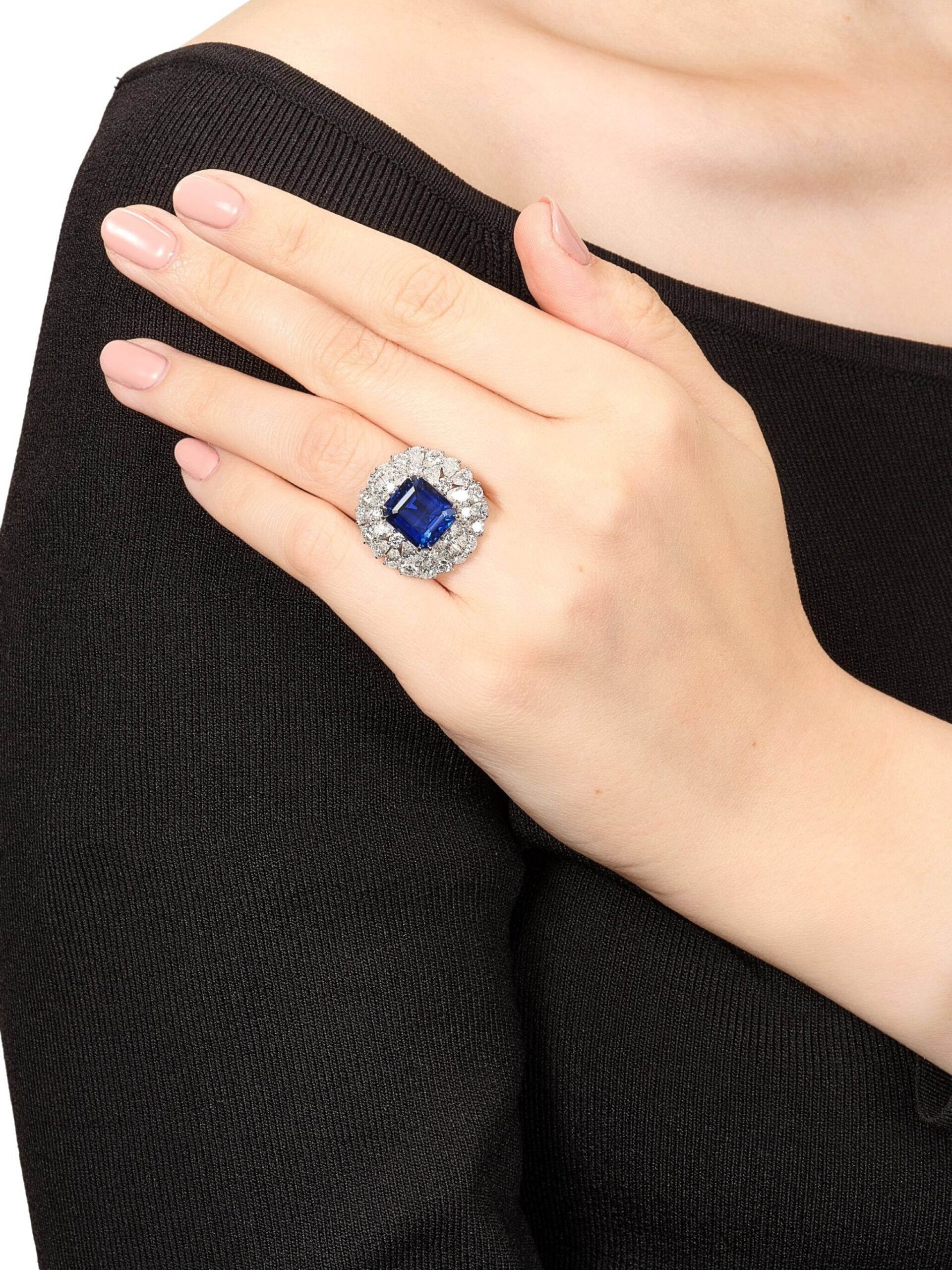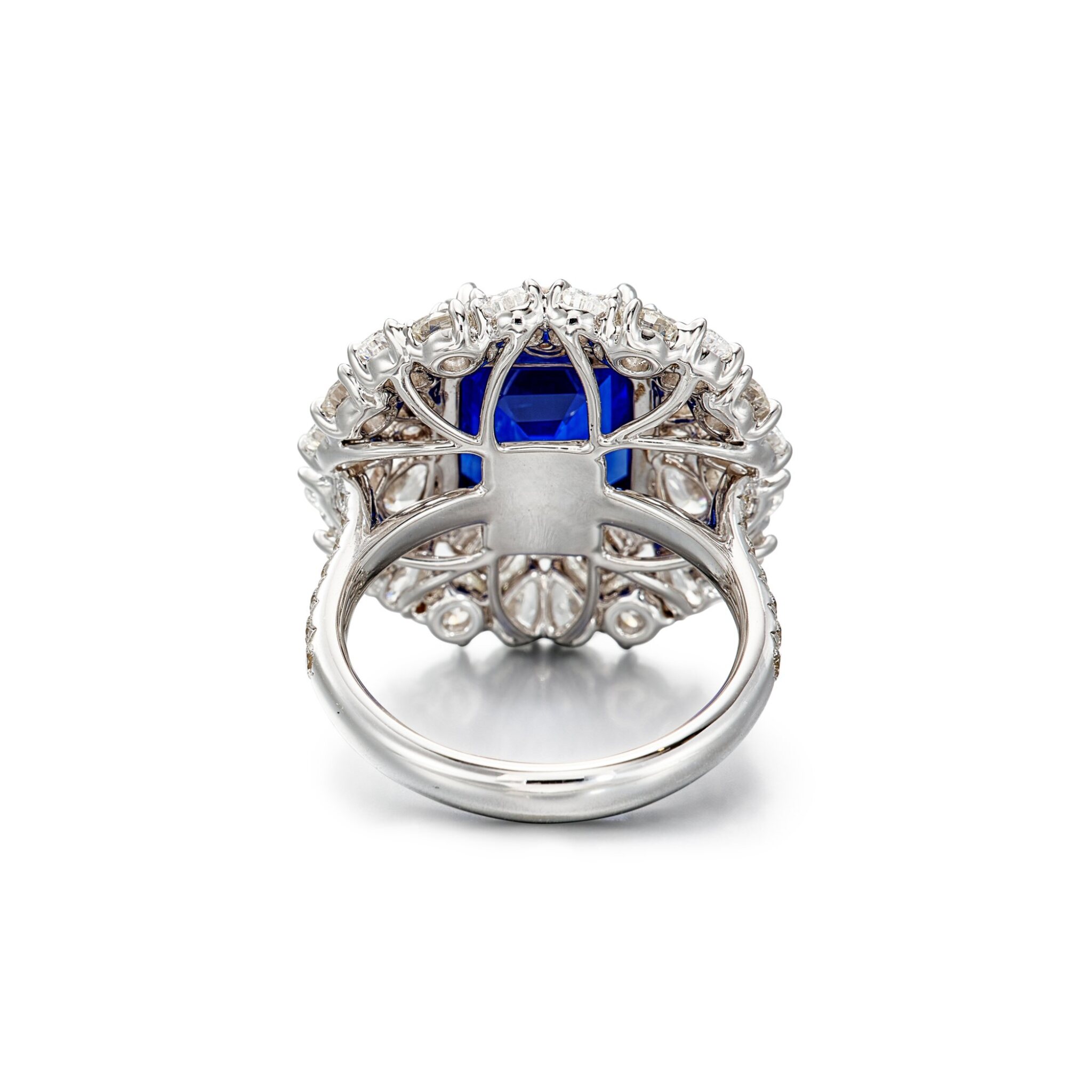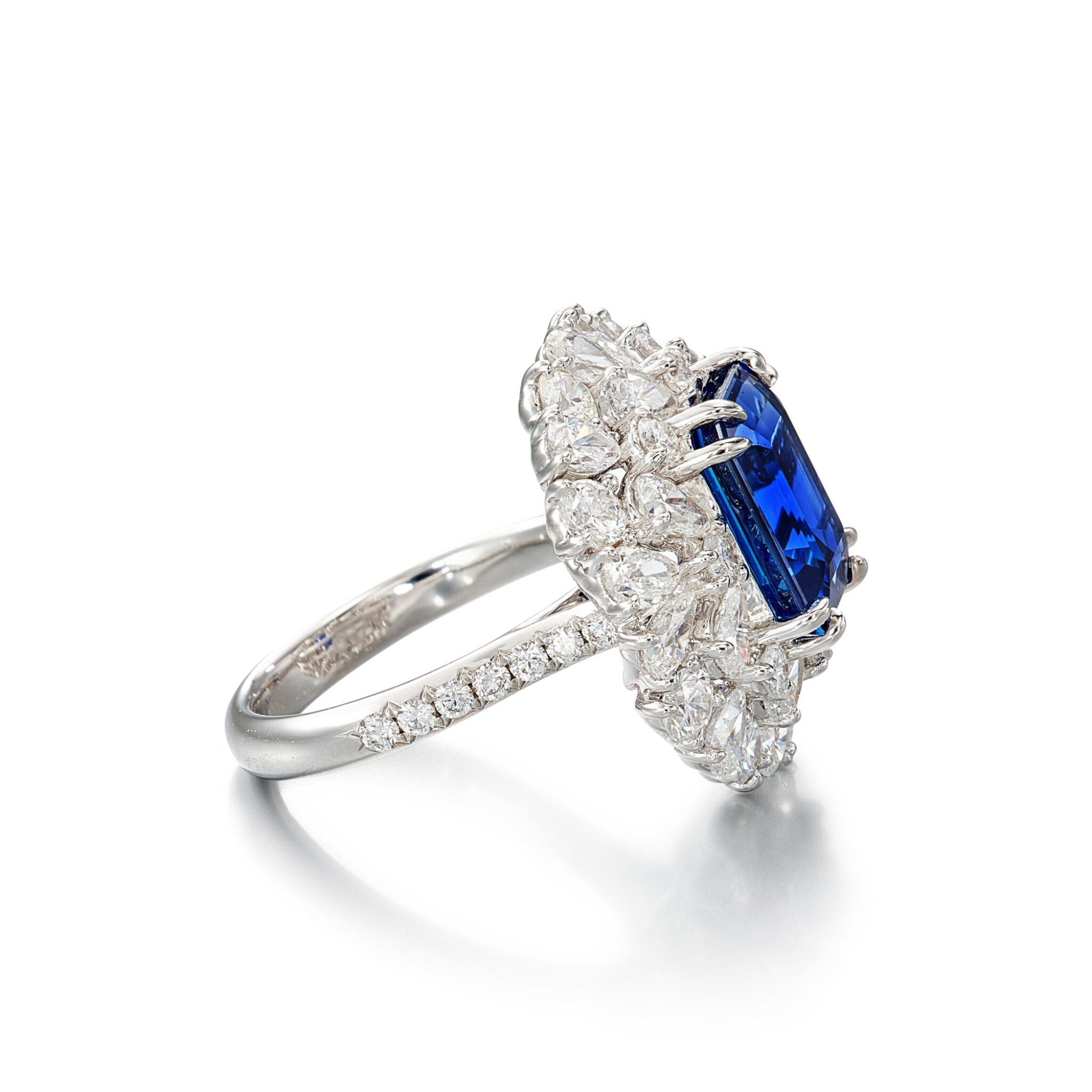 The restrained metalwork is deliberately secondary, so the diamonds and gemstones and their Royal Blue Sapphire character define the mood and identity of the ring entirely.