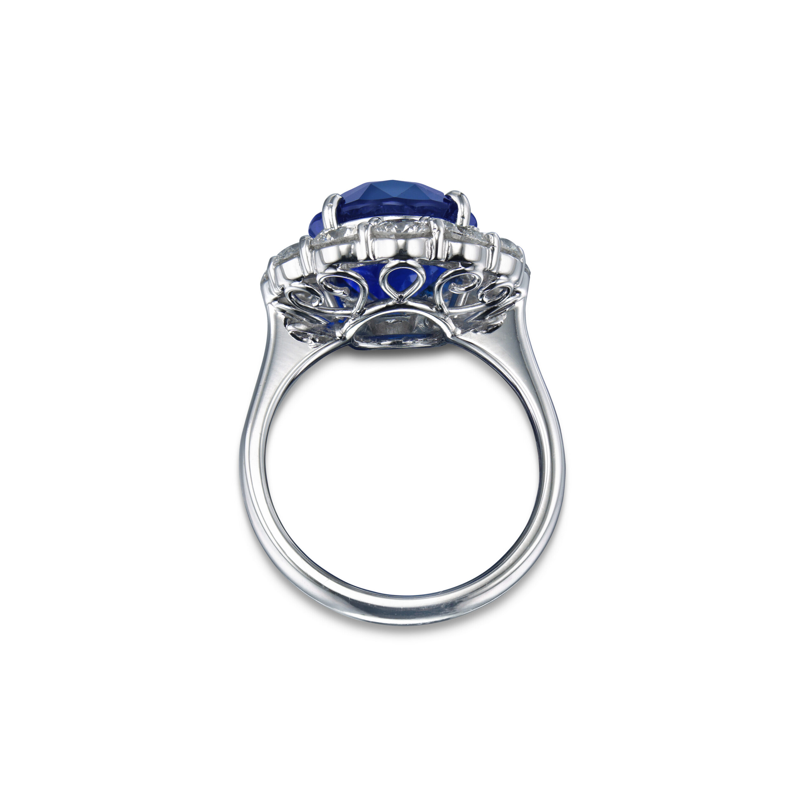 Viewed from the side as well as from above, the architecture reveals how carefully the diamonds and gemstones are staged. The approximately 8.09 carats of Royal Blue Sapphire oval diamonds are set at slightly graduated heights and tilts so they catch and return light to the viewer from multiple directions.