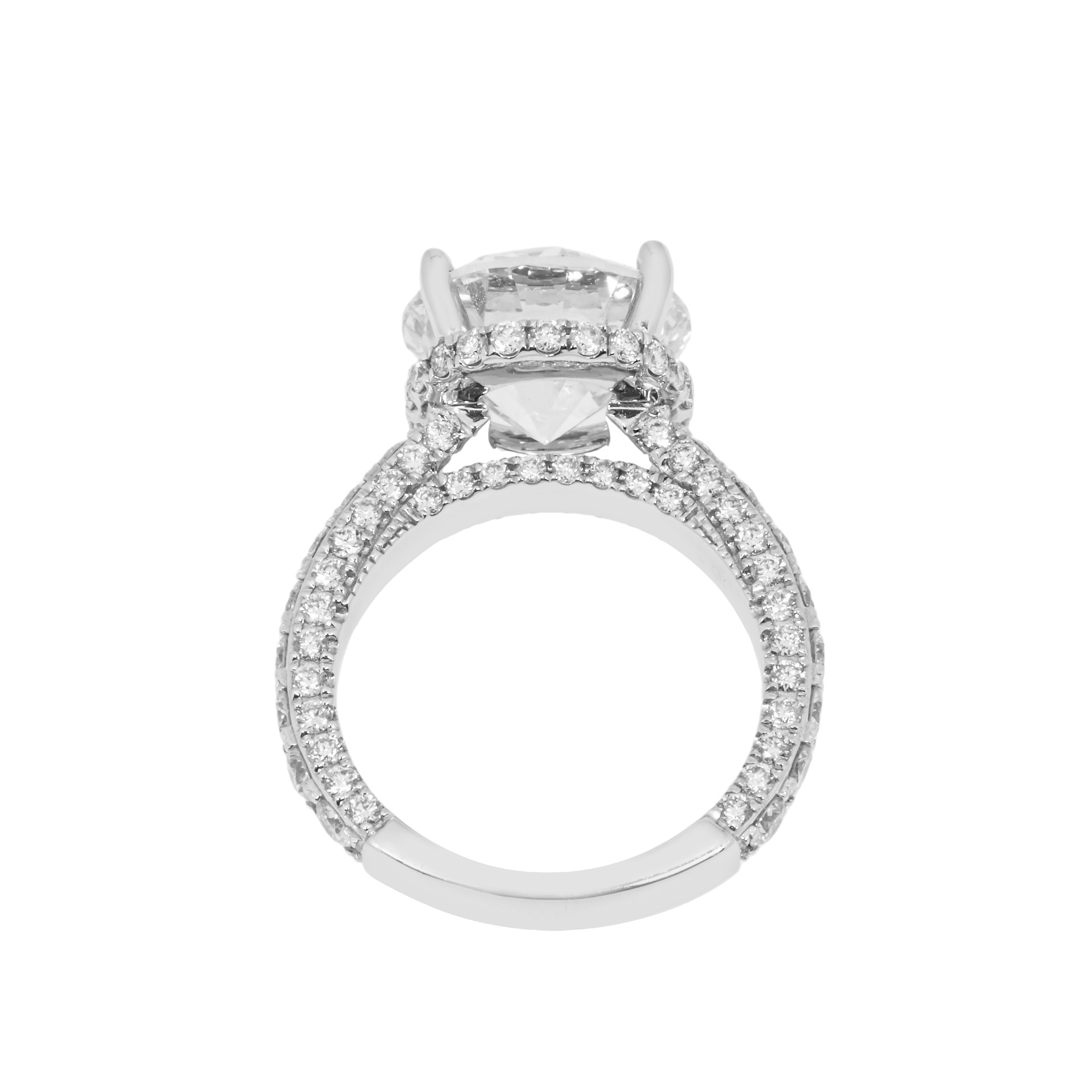 Viewed from the side as well as from above, the architecture reveals how carefully the diamonds are staged. The approximately Carat weight on request of Brilliant White round diamonds are set at slightly graduated heights and tilts so they catch and return light to the viewer from multiple directions.