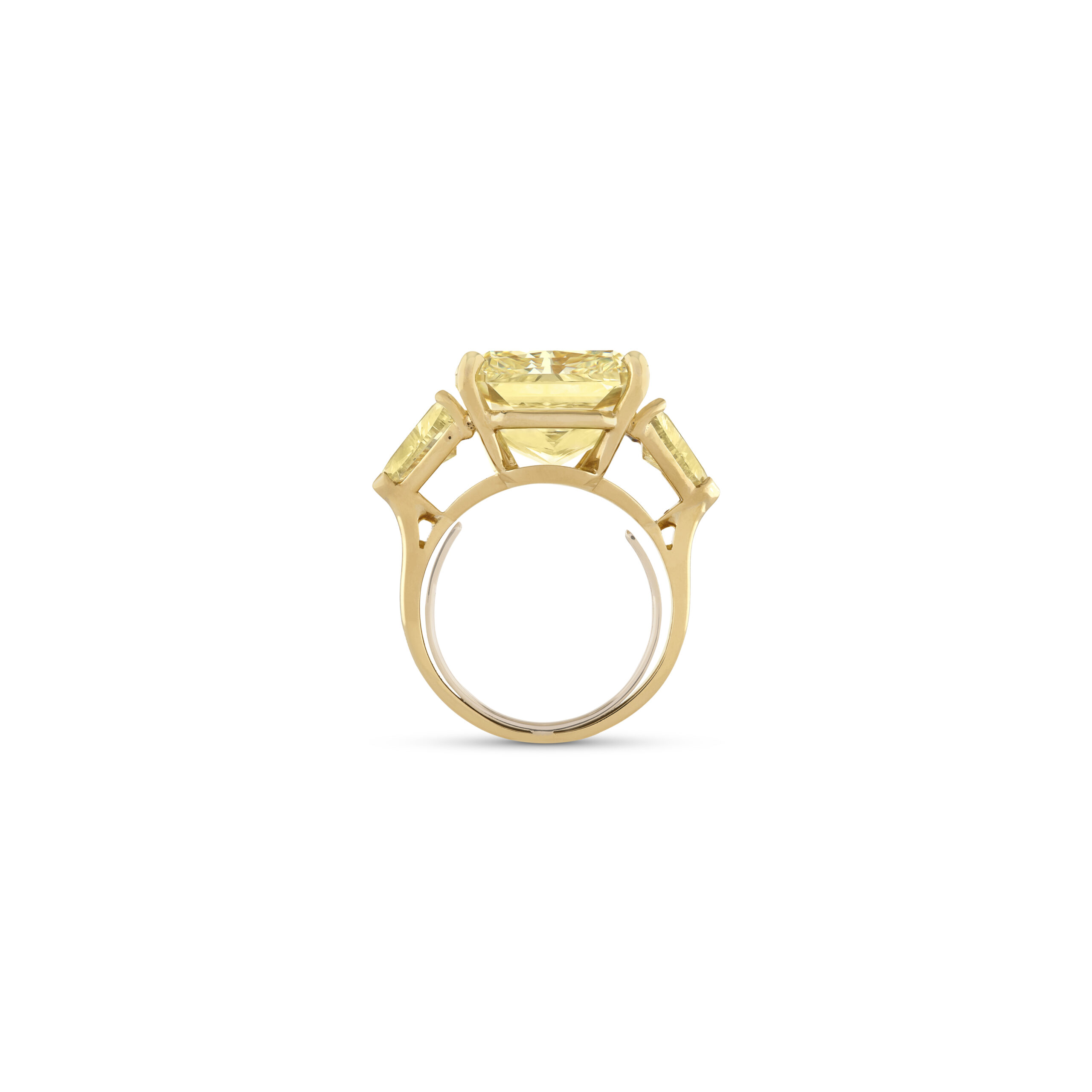 Inspired by the great high jewelry rings seen on red carpets and at state dinners, this Legacy creation showcases approximately 8 carats of Fancy Yellow Cushion cut diamonds in a deliberately timeless profile.
