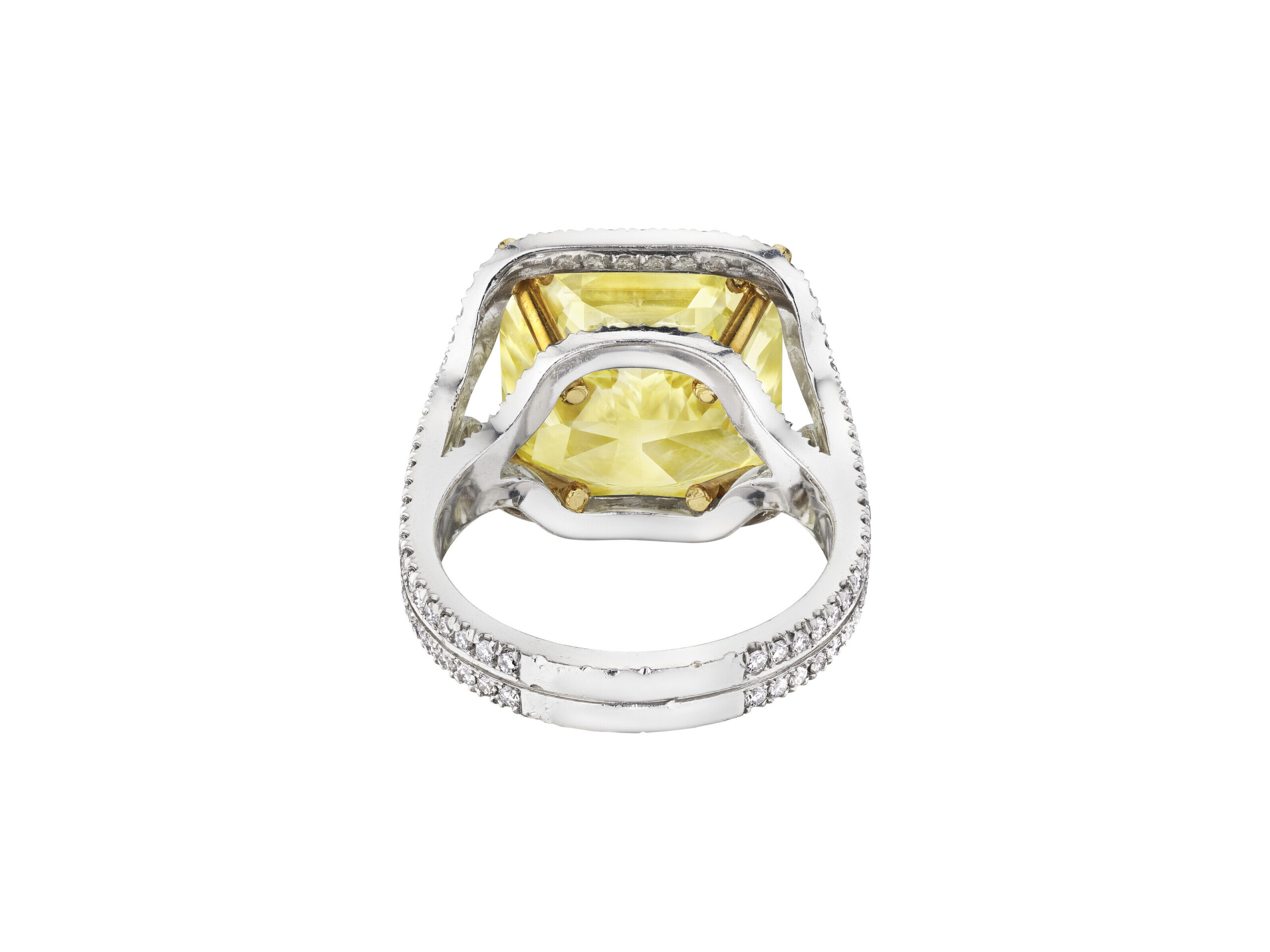 Celebrating the powerful allure of Fancy Yellow diamonds, this Legacy ring showcases approximately 8 carats of Cushion cut diamonds in a luminous high jewelry silhouette.