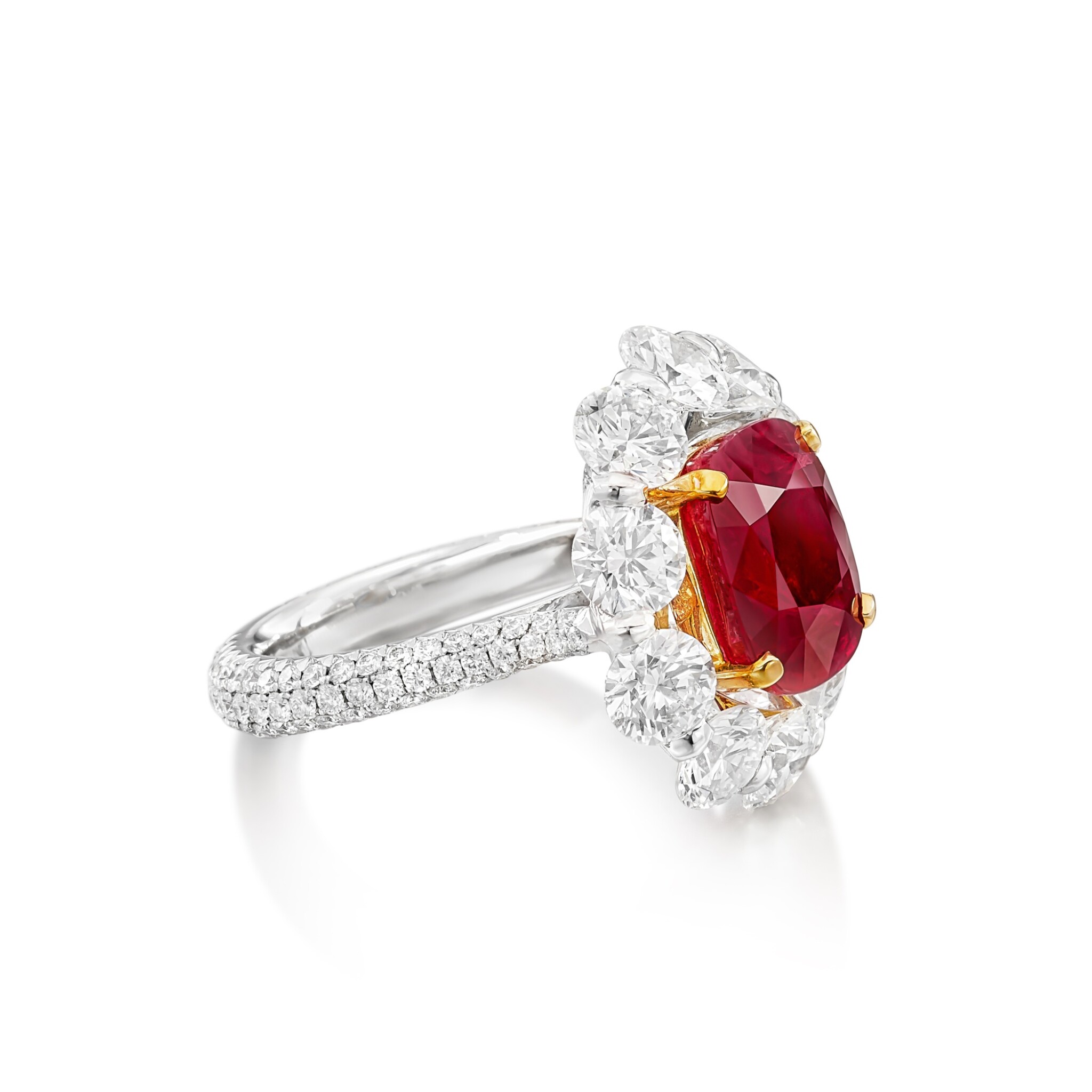 At the heart of this ring sits approximately 8 carats of meticulously selected Ruby Red Cushion cut diamonds, arranged to create a continuous plane of light across the finger.