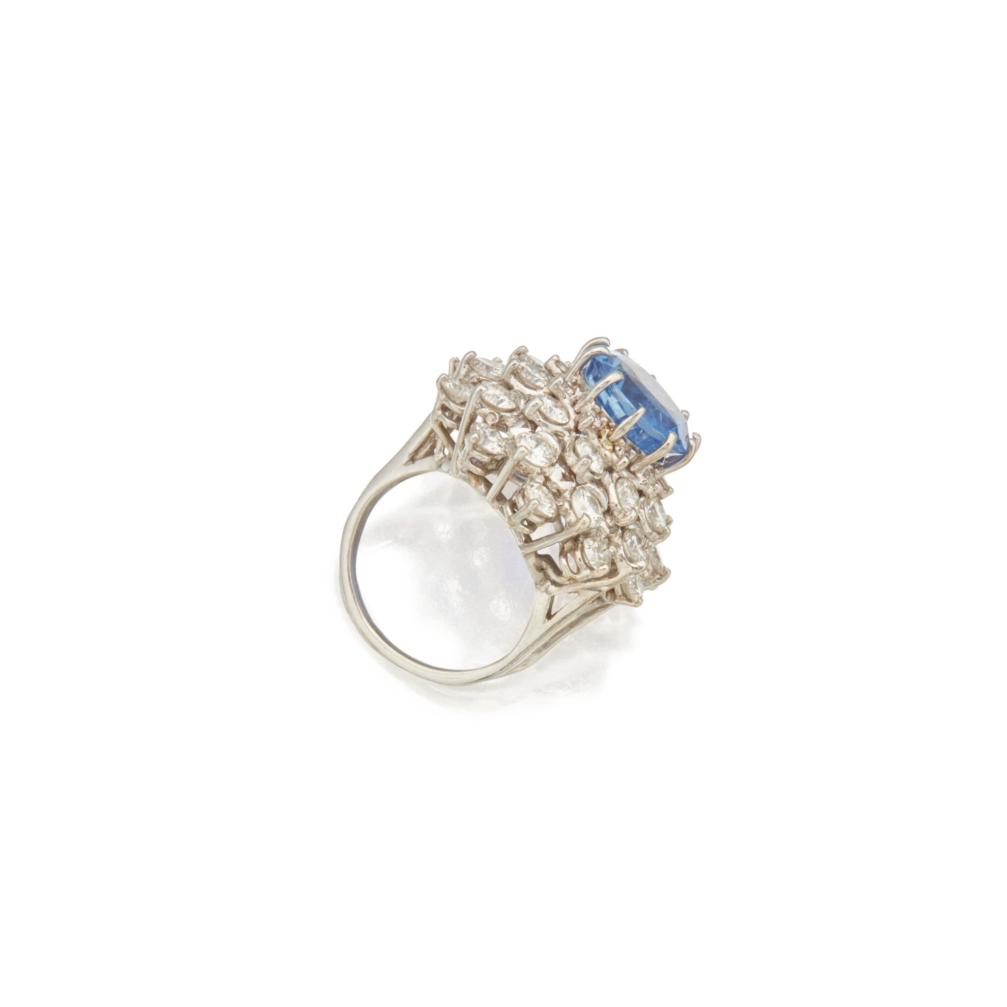 Viewed from the side as well as from above, the architecture reveals how carefully the diamonds and gemstones are staged. The approximately 8 carats of Royal Blue Sapphire oval diamonds are set at slightly graduated heights and tilts so they catch and return light to the viewer from multiple directions.