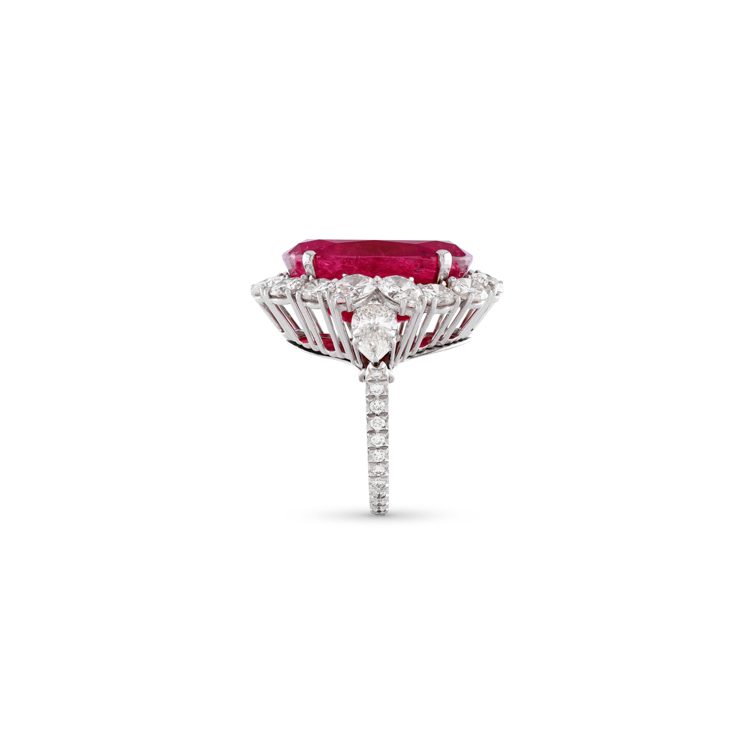 Approximately 8 carats, oval, statement ring, diamond ring. Designed to feel like a personal signature: refined, wearable, and unmistakably high-end. Colour family: Ruby Red. Metal: 14K White Gold. The silhouette is disciplined and intentional, designed to keep the piece elegant rather than overstated. Its value is in its discipline: the ring looks composed up close and commanding from across a room. An enduring asset in jewel form: beautiful to wear, credible to document. Radiant Elegance—a piece defined by brilliance, poise, and longevity.