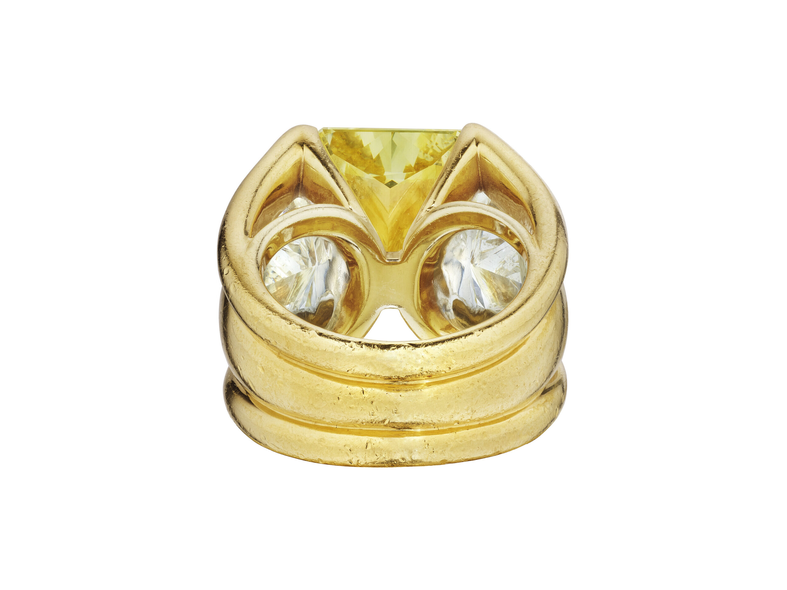 Inspired by the great high jewelry rings seen on red carpets and at state dinners, this Legacy creation showcases approximately 8 carats of Fancy Yellow Radiant cut diamonds in a deliberately timeless profile.