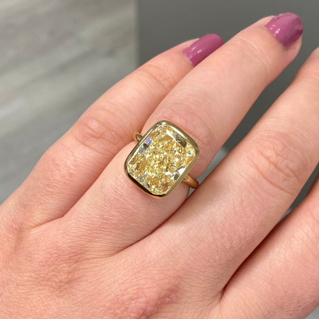 The interplay of 9.01 carats and Fancy Yellow produces a ring that reads as a serious carat investment on the hand. At the same time, the controlled height and footprint ensure it sits securely and comfortably through a full day or evening.
