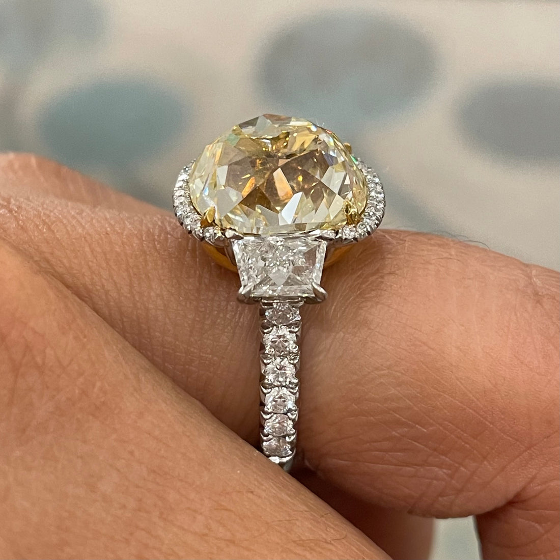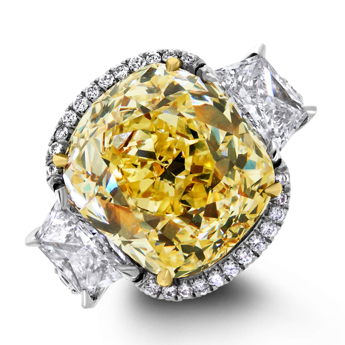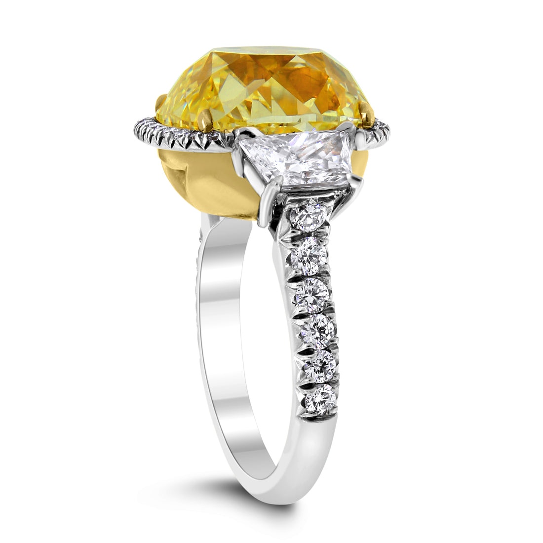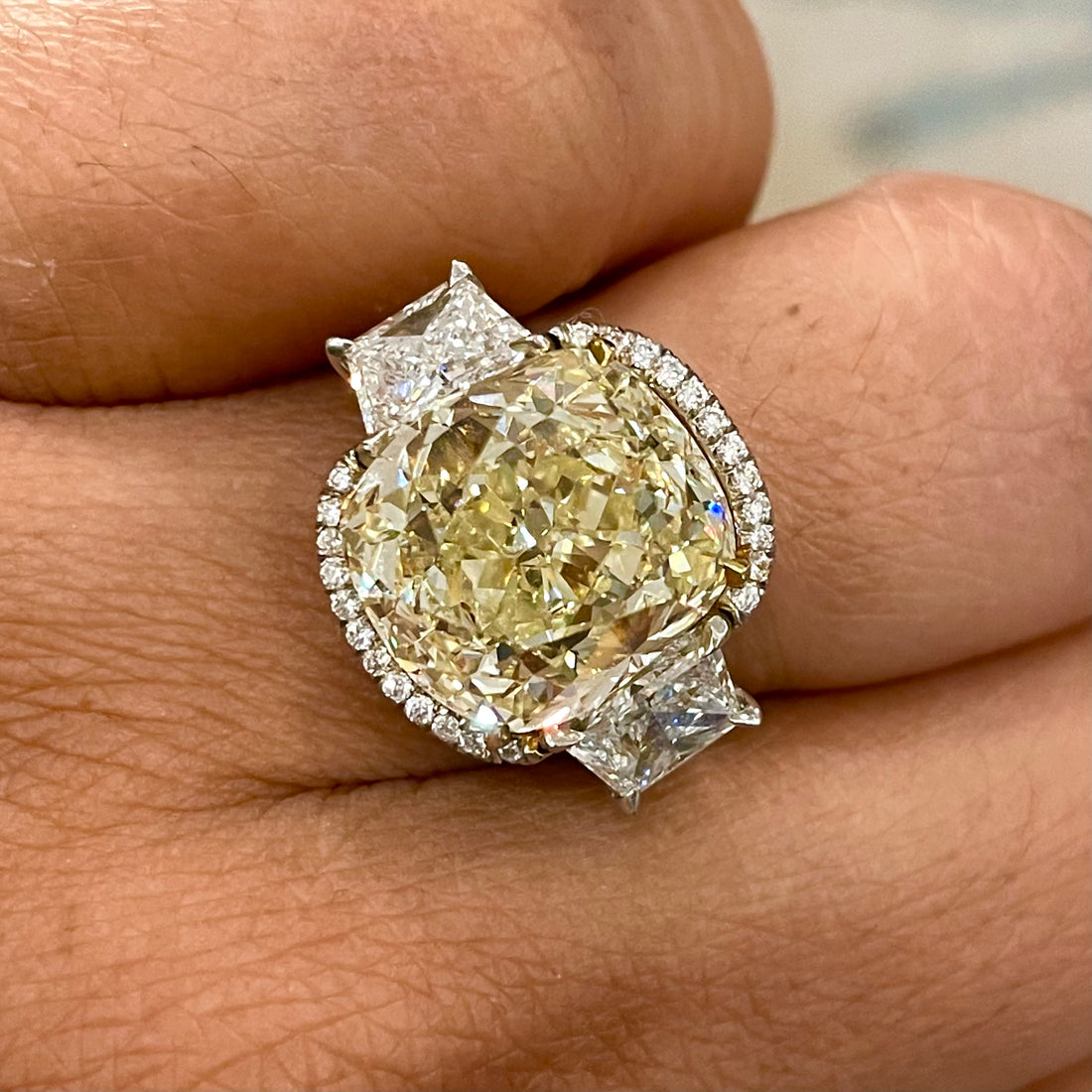 Viewed from any angle, the approximately 9.77 carats of Fancy Yellow Cushion cut diamonds create a wide field of brilliance across the finger. The carat weight is generous enough to be unmistakable in a room, yet balanced so that the ring never feels overpowering.