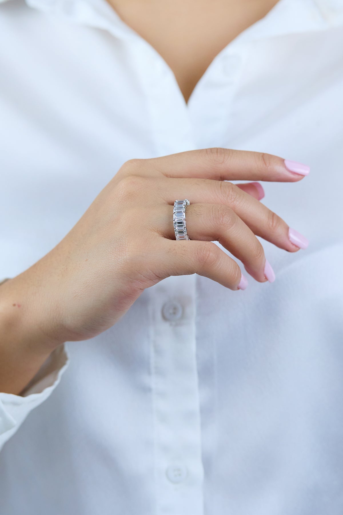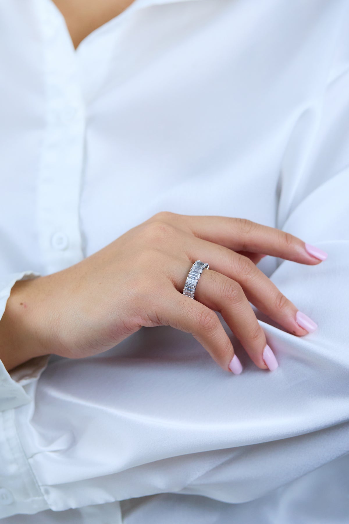 Styled correctly, a 9.94 carats Brilliant White Wedding Band like this can anchor your entire jewelry story. In the day, keep things deliberate and minimal β a single wedding band or eternity ring, a discreet pair of studs and perhaps one bracelet are enough to let the diamonds and gemstones speak without competition.