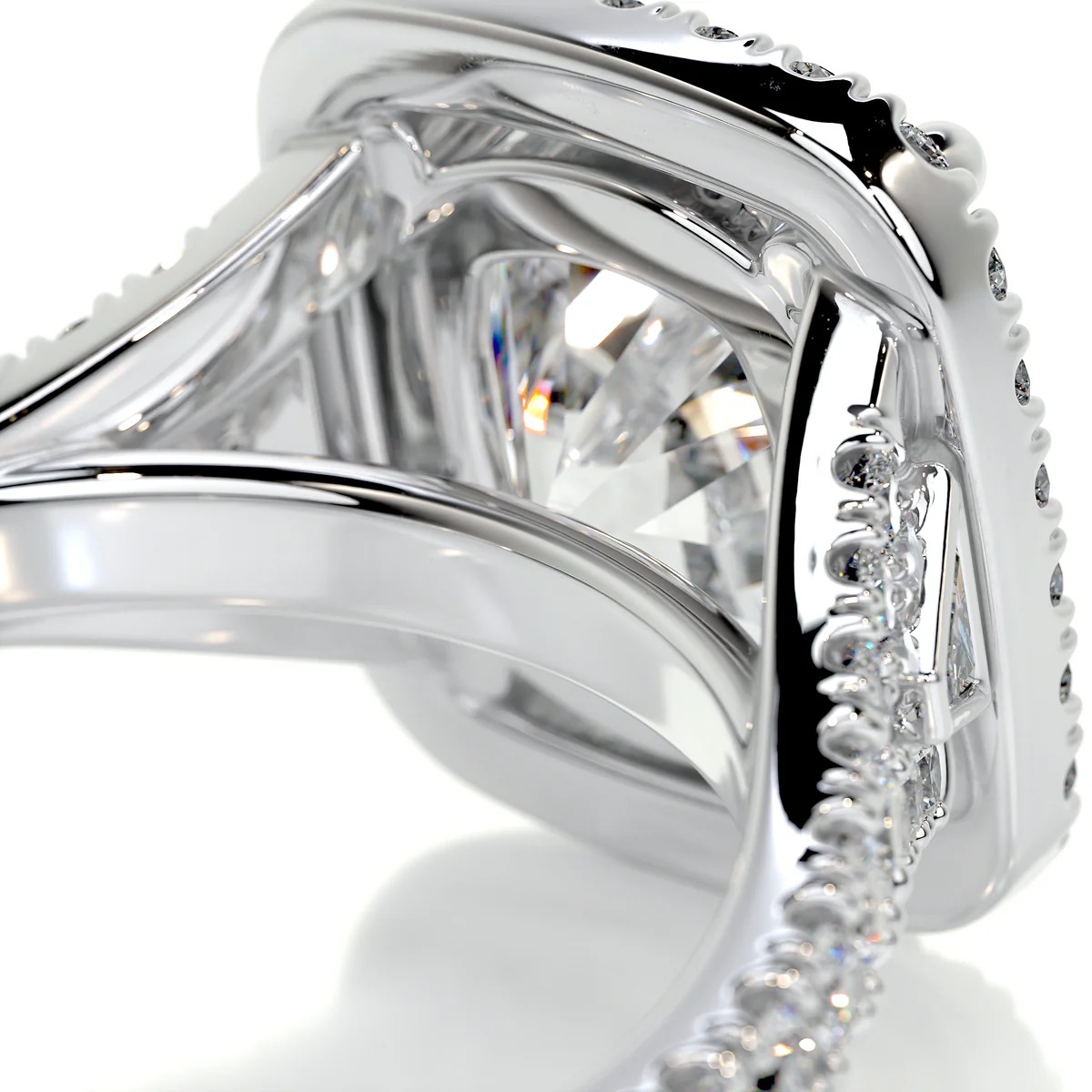 Viewed from the side as well as from above, the architecture reveals how carefully the diamonds are staged. The approximately 9 carats of Brilliant White Cushion cut diamonds are set at slightly graduated heights and tilts so they catch and return light to the viewer from multiple directions.