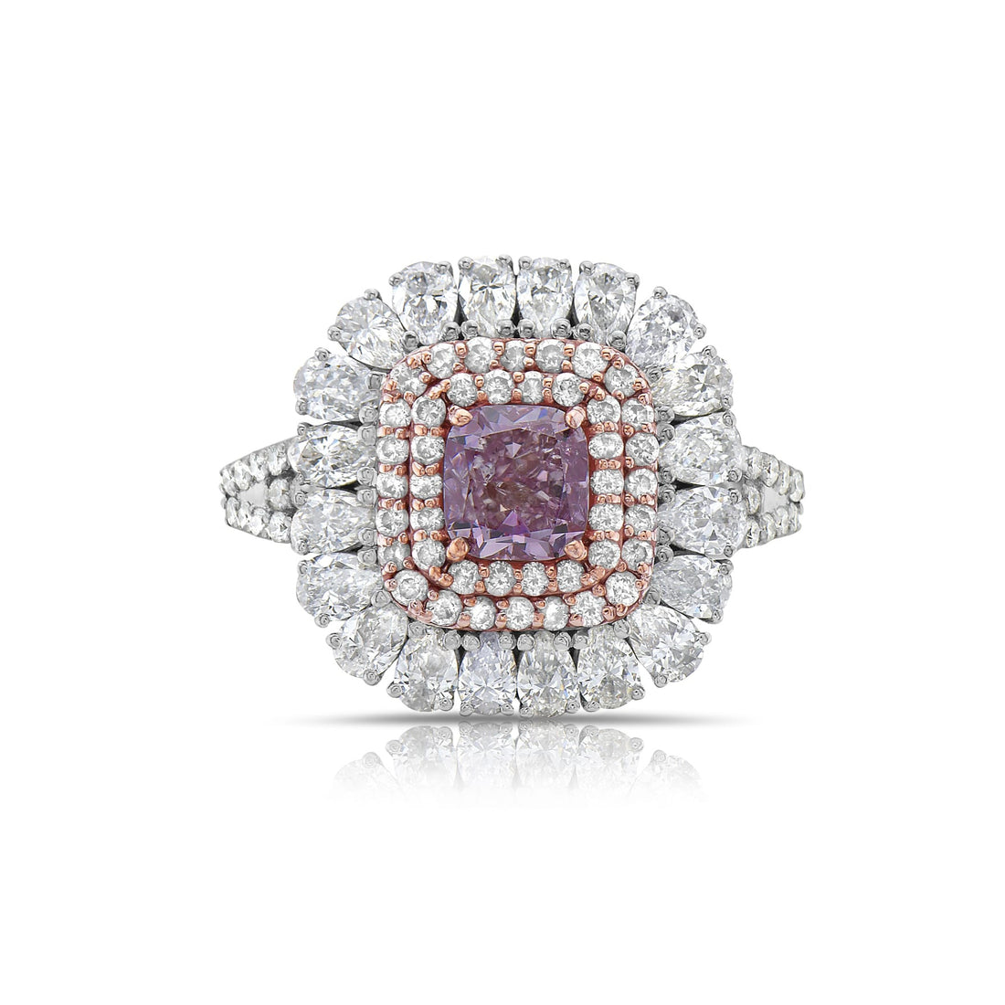 Nothing about this ring is accidental. Legacy goldsmiths begin by sketching how the Cushion silhouette should appear from above, from the side and in profile, then translate that vision into a measured architecture in 14K White Gold that respects the proportions of the fancy colour diamonds rather than fighting them.