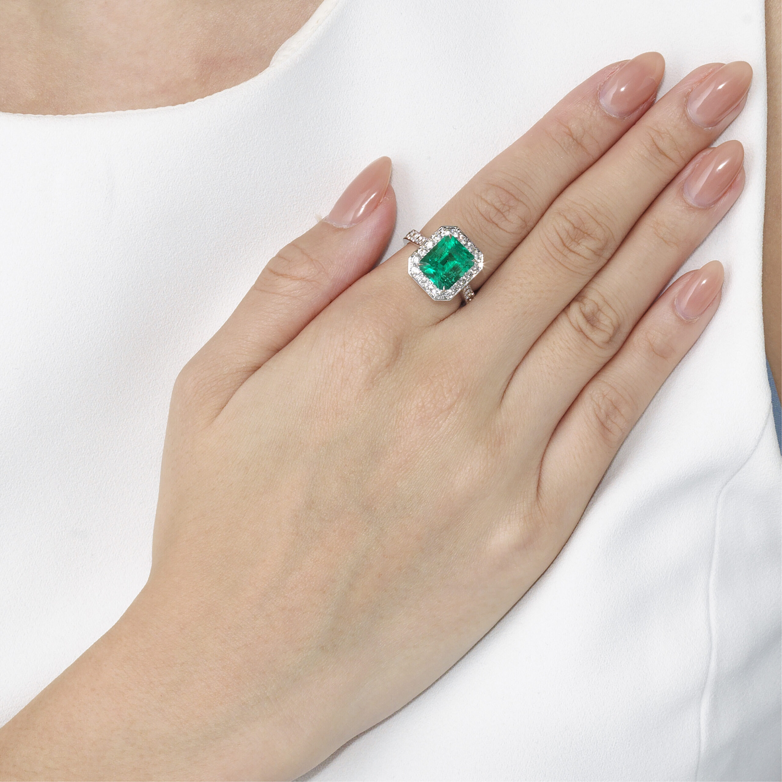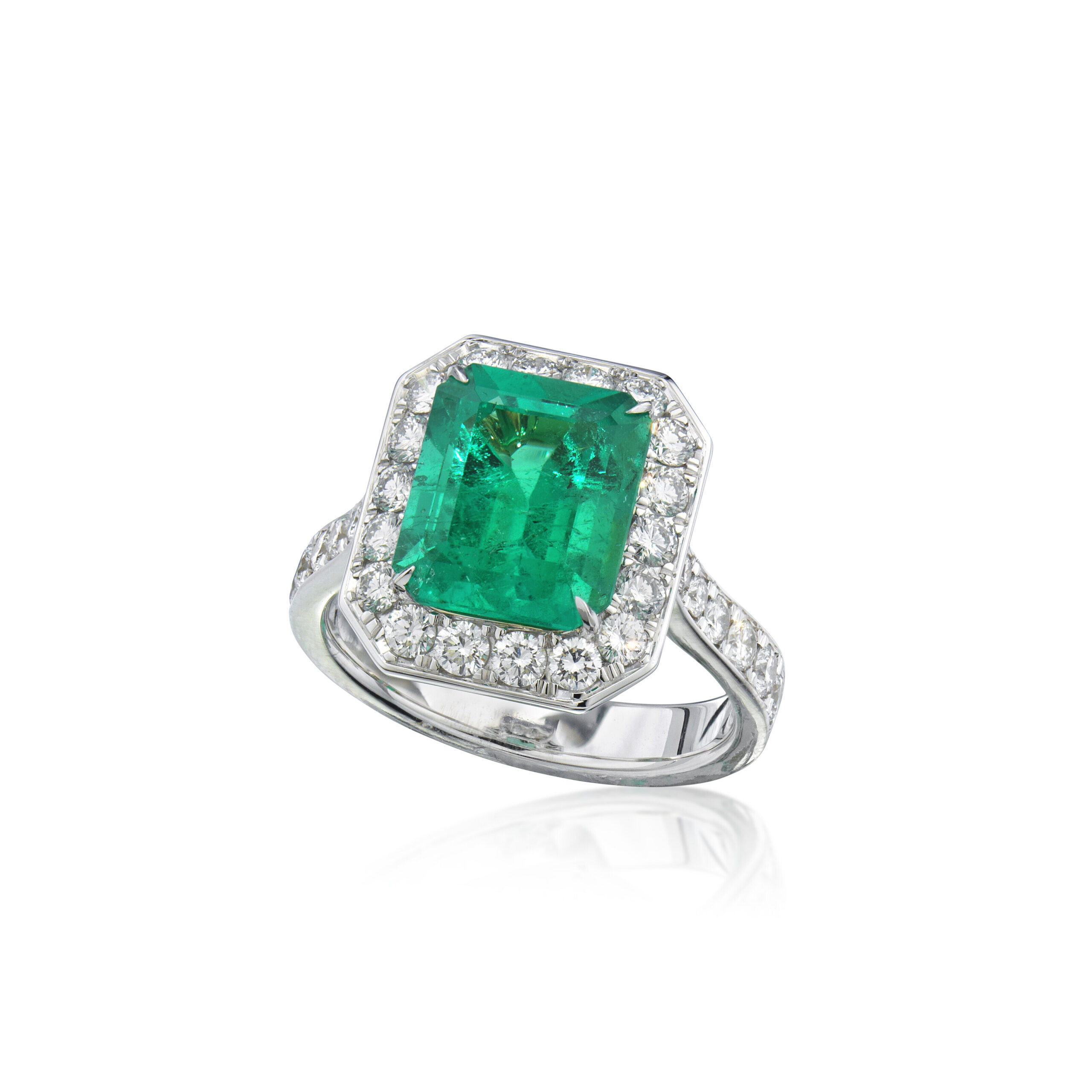The restrained metalwork is deliberately secondary, so the diamonds and gemstones and their Emerald Green character define the mood and identity of the ring entirely.