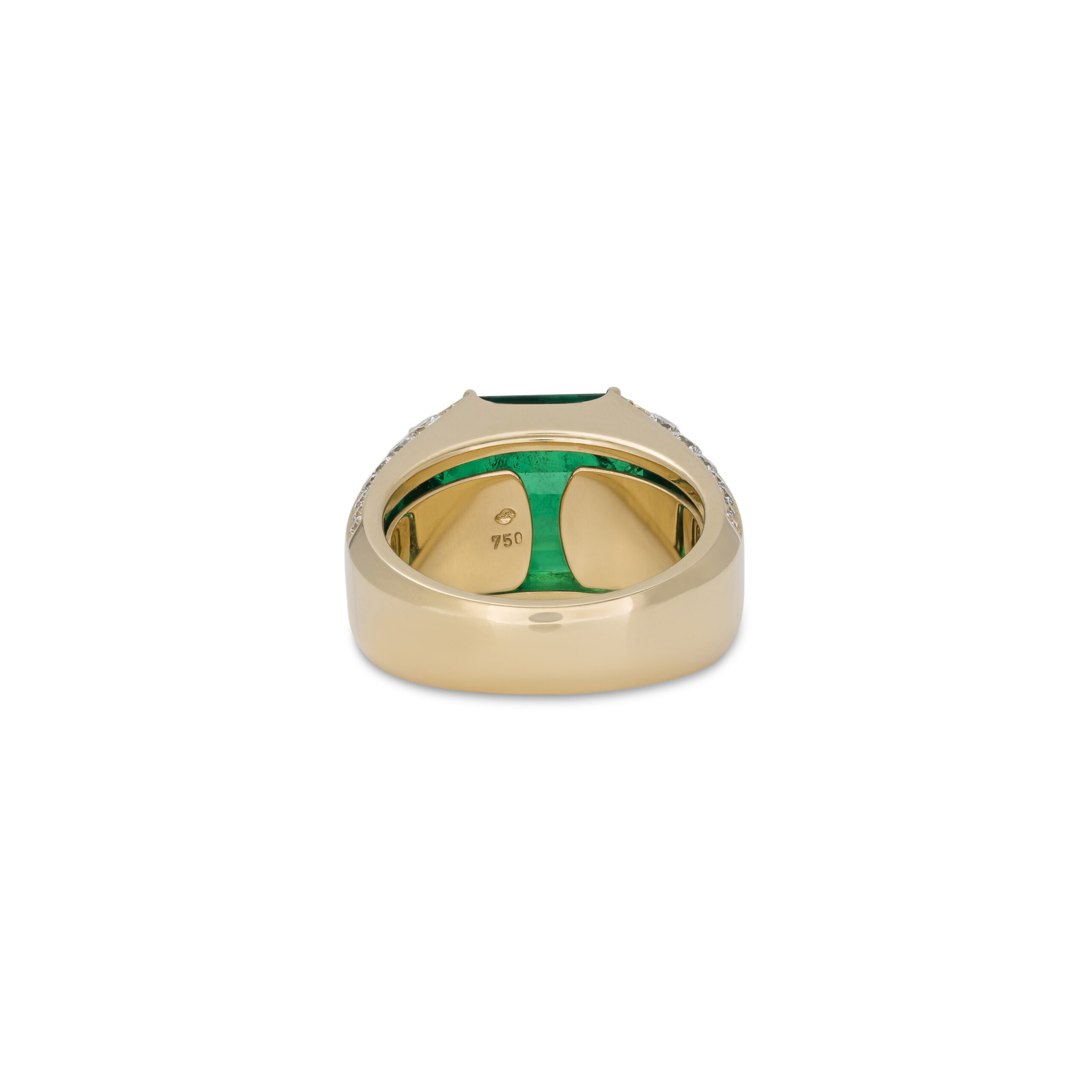 The interplay of Carat weight on request and Emerald Green produces a ring that reads as a serious carat investment on the hand. At the same time, the controlled height and footprint ensure it sits securely and comfortably through a full day or evening.
