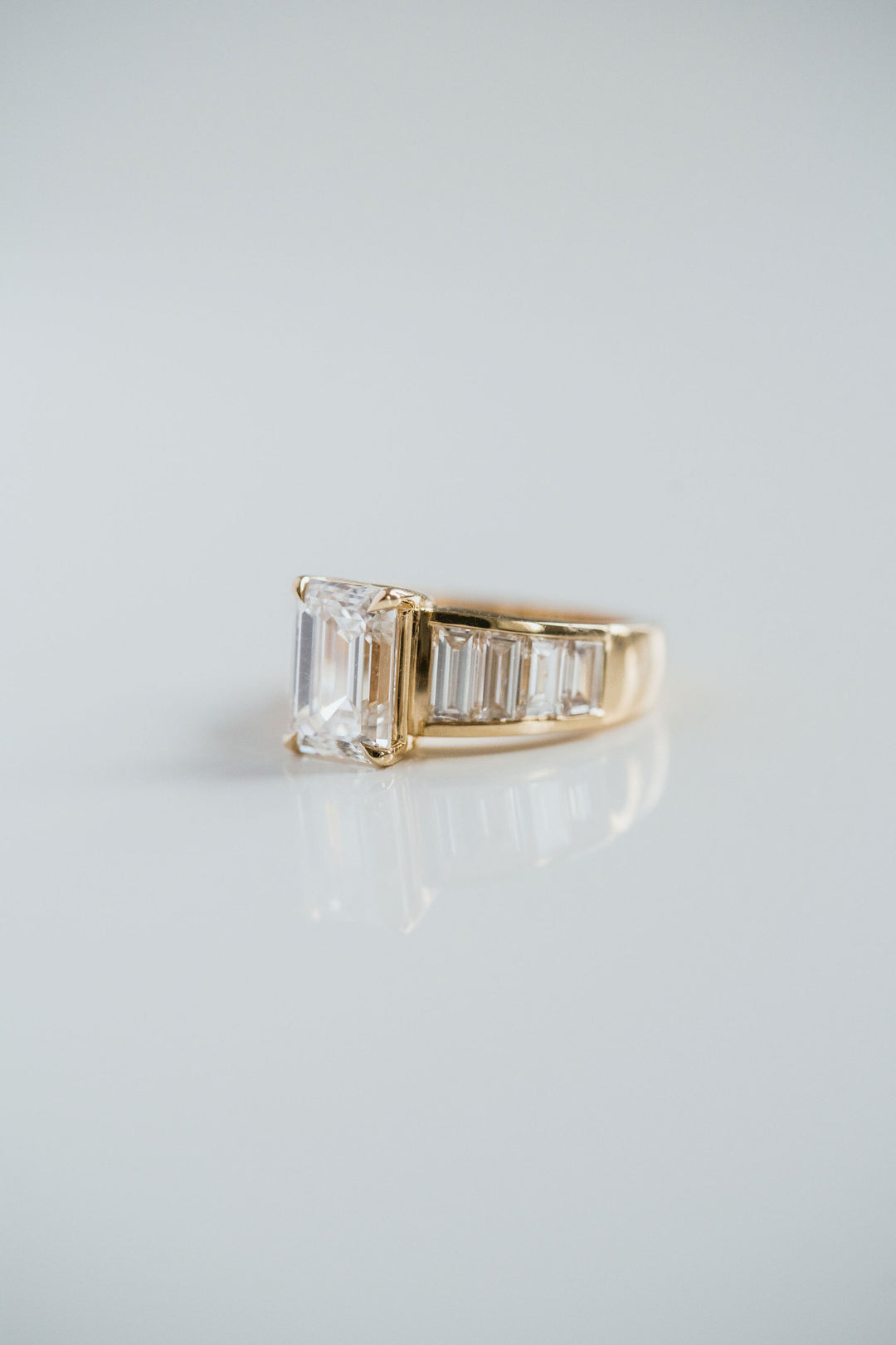 Lead times of approximately 3–8 weeks depending on bespoke options – contact us to confirm the exact lead time; this reflects the fact that each ring is built to your specification rather than drawn from stock. Finger size, preferred metal tone, and even subtle details like how prominently the Emerald Cut stones sit above the band in 14K White Gold can all be personalised.