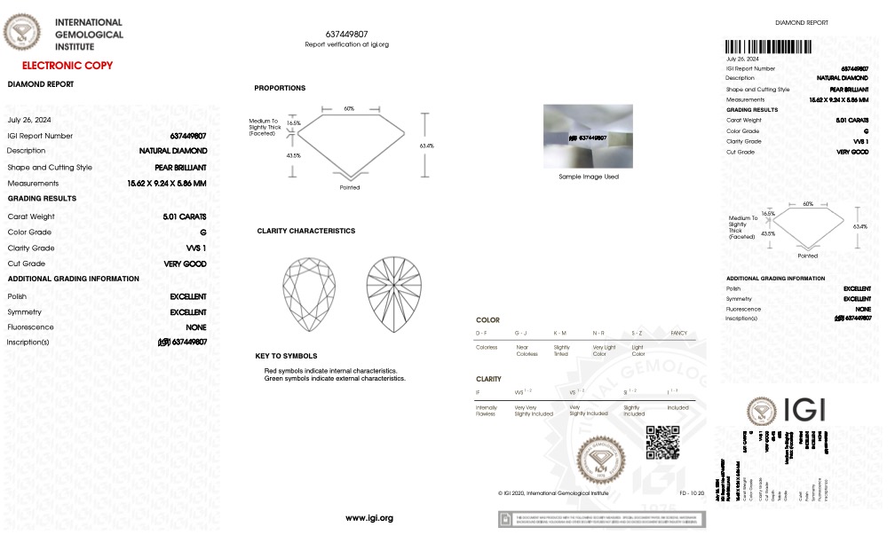 The IGI Certified 5.01 Carat Pear Cut Diamond Ring is a breathtaking example of brilliance, craftsmanship, and timeless elegance. Featuring VVS1 clarity and a radiant G color, this diamond exudes exceptional purity and sparkle. Certified by the International Gemological Institute (IGI), this ring guarantees the highest standards of quality and authenticity. Its graceful pear-shaped cut enhances light performance, creating a unique and sophisticated design, perfect for engagements, milestones, or as a cherished addition to any luxury collection.