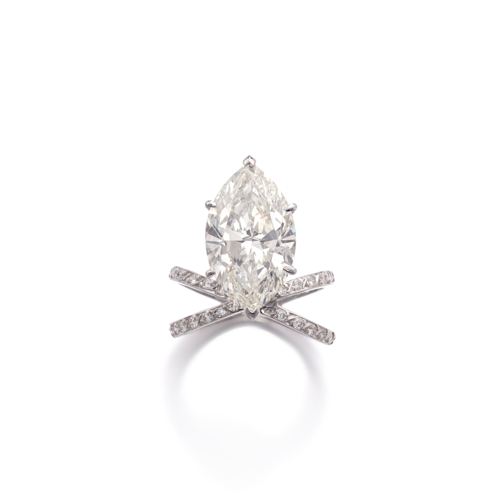 Approximately 4 carats, marquise, statement ring, diamond ring. A connoisseur-led design where the face-up stays calm, crisp, and intentionally luxurious. Colour family: Brilliant White. Clarity: VVS. It wears with authority without shouting—substantial enough to anchor a look, restrained enough to stay timeless. The craftsmanship is engineered so the sparkle reads as one surface of light—not scattered points competing for attention. An enduring asset in jewel form: beautiful to wear, credible to document. Precision-Cut Radiance—a piece defined by brilliance, poise, and longevity.